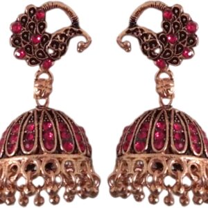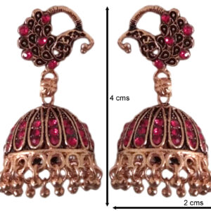 Antique Gold Jhumki Earrings with Deep Red Crystal Stones