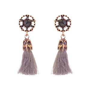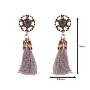 These elegant tassel drop earrings feature a detailed floral stud with a smoky grey stone at the centre, accented by subtle crystal highlights and an antique gold finish. The ...