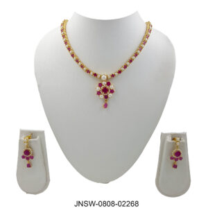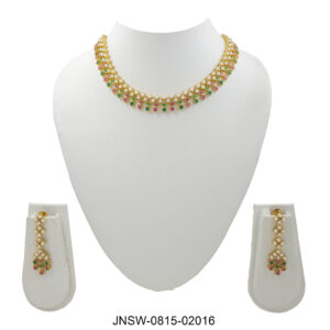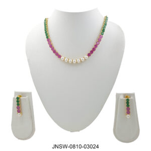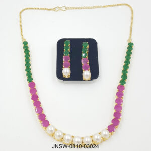 A vibrant dual-tone necklace set crafted with alternating ruby and emerald stones, finished with a row of classic pearls at the center. This lightweight statement adds the perfect pop ...