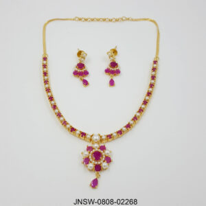 This elegant necklace set showcases a stunning combination of ruby-red stones and luminous pearls set in a rich gold-plated finish. The necklace features a symmetrical design with alternating pearls ...