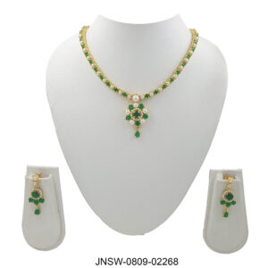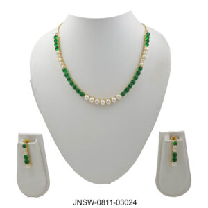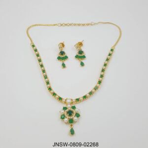 This graceful necklace set features a striking combination of emerald green stones and soft white pearls arranged beautifully along a gold-plated chain. At the center sits a delicate floral ...