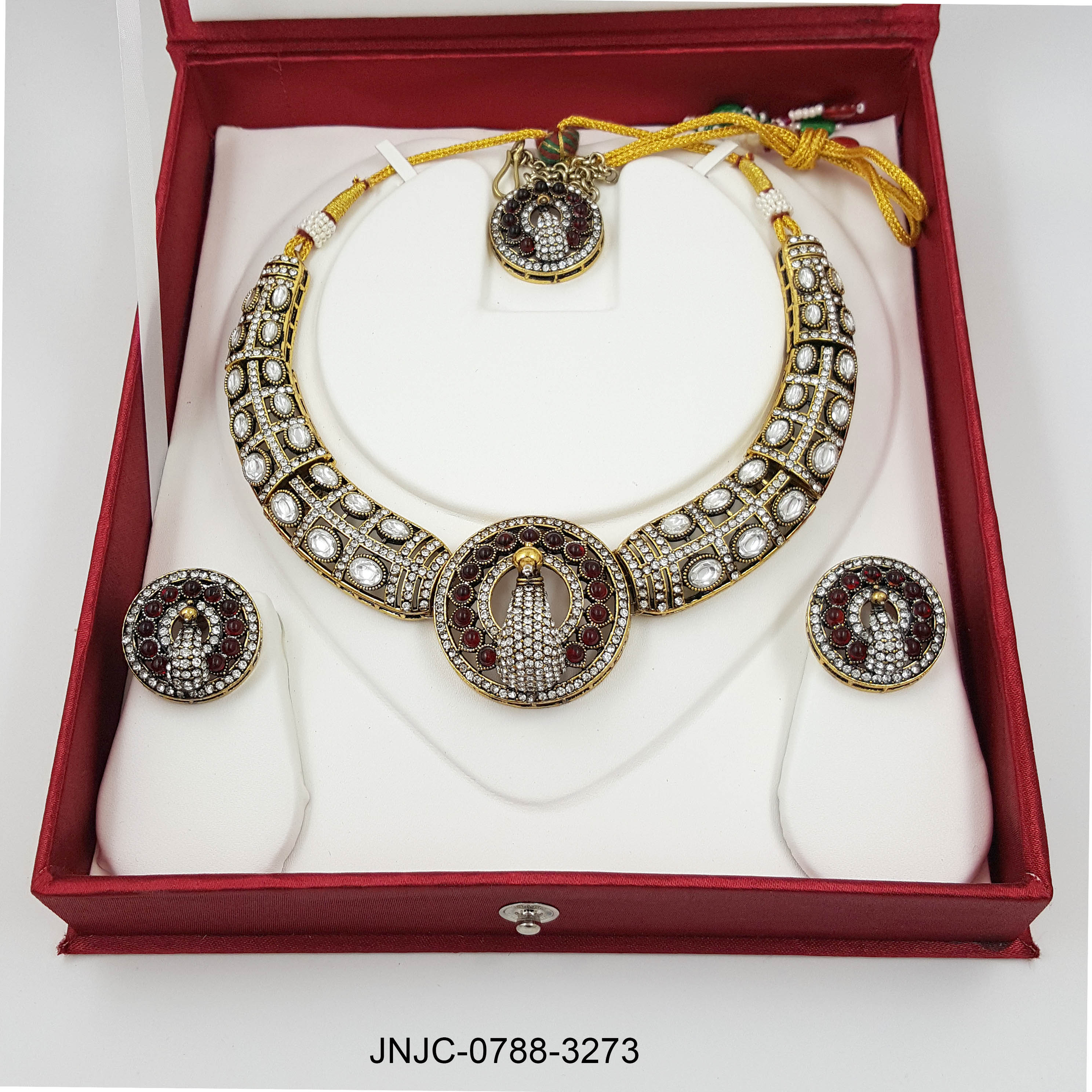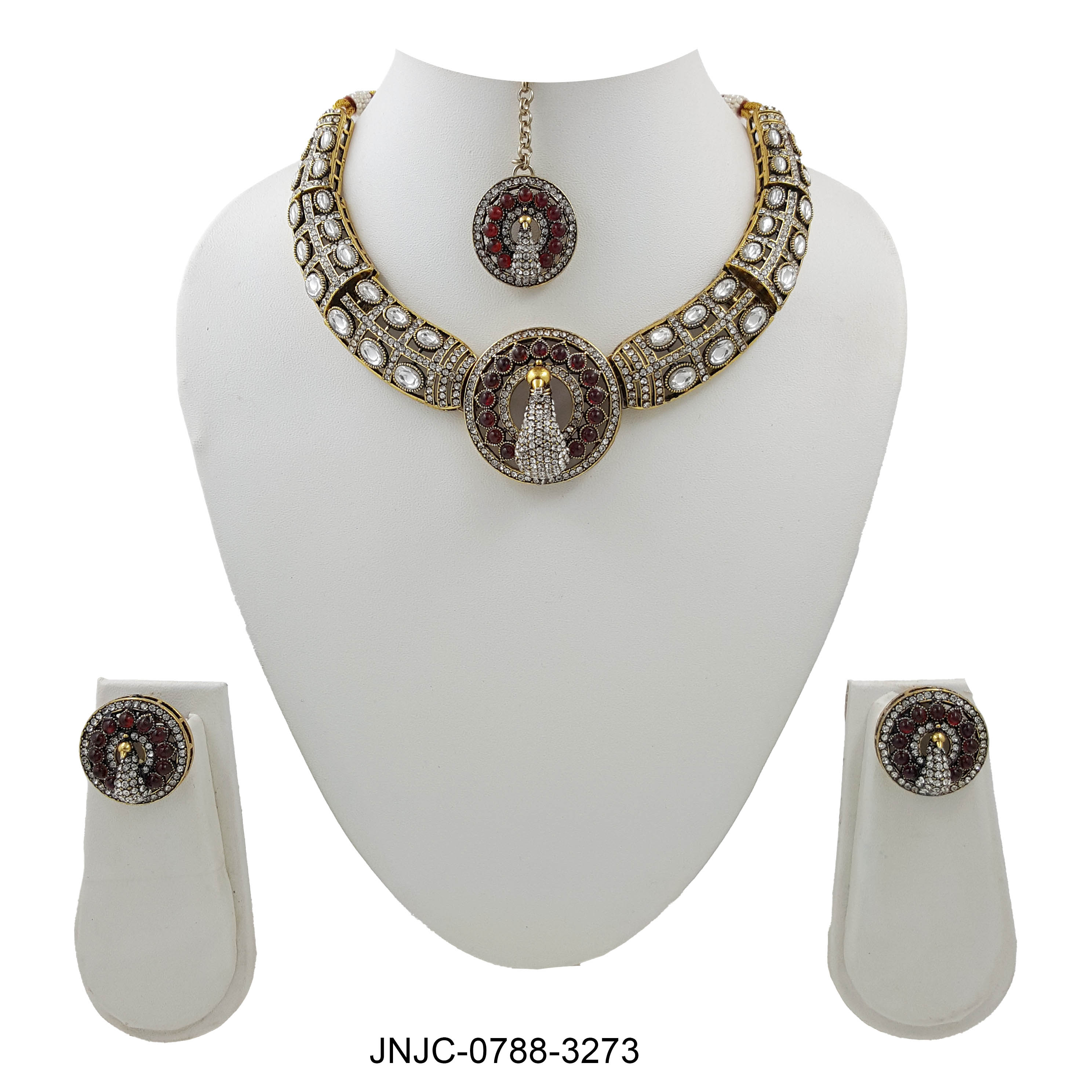 Crimson Royale Peacock Kundan Set – Ruby Red and White Stone Necklace with Earrings and Maang Tikka
