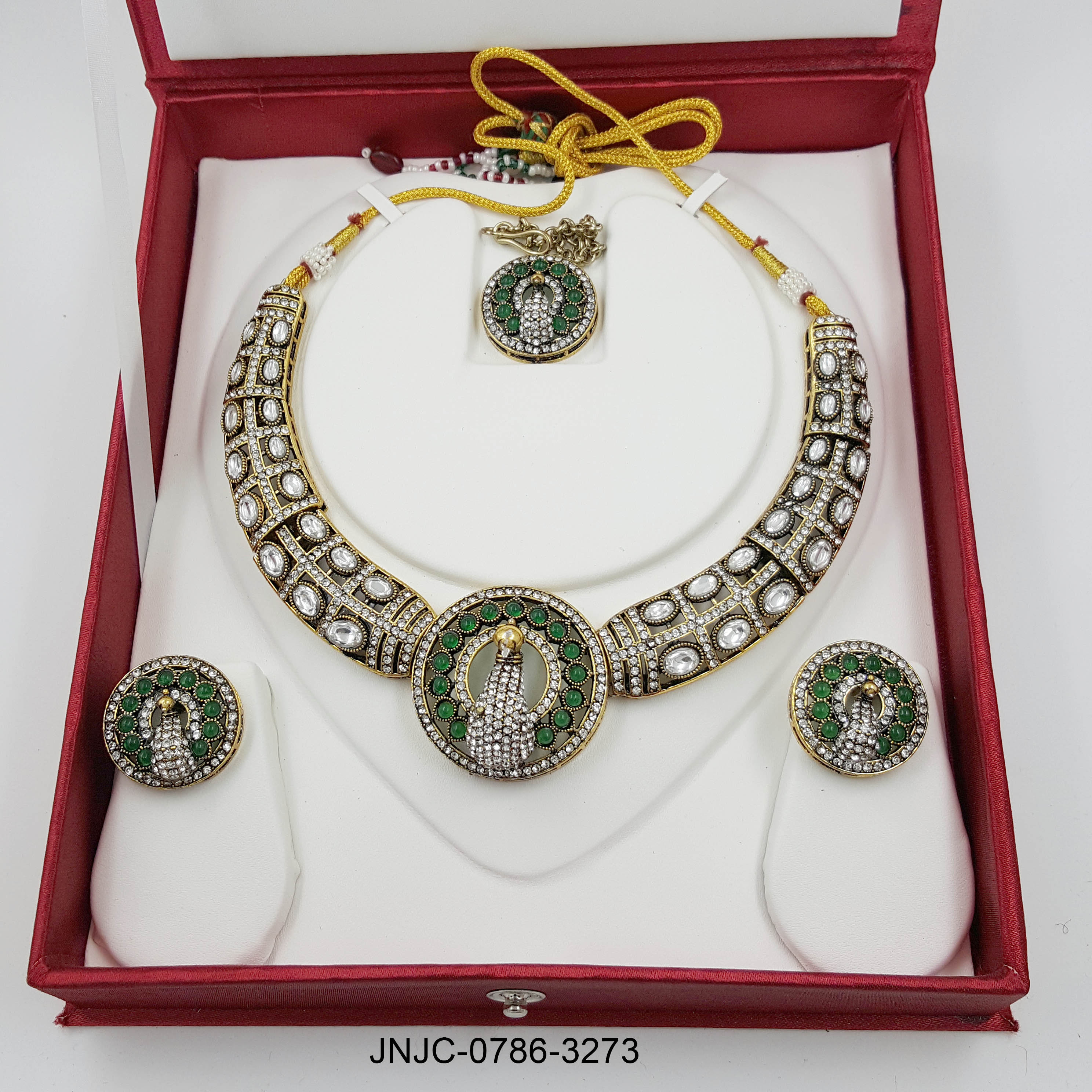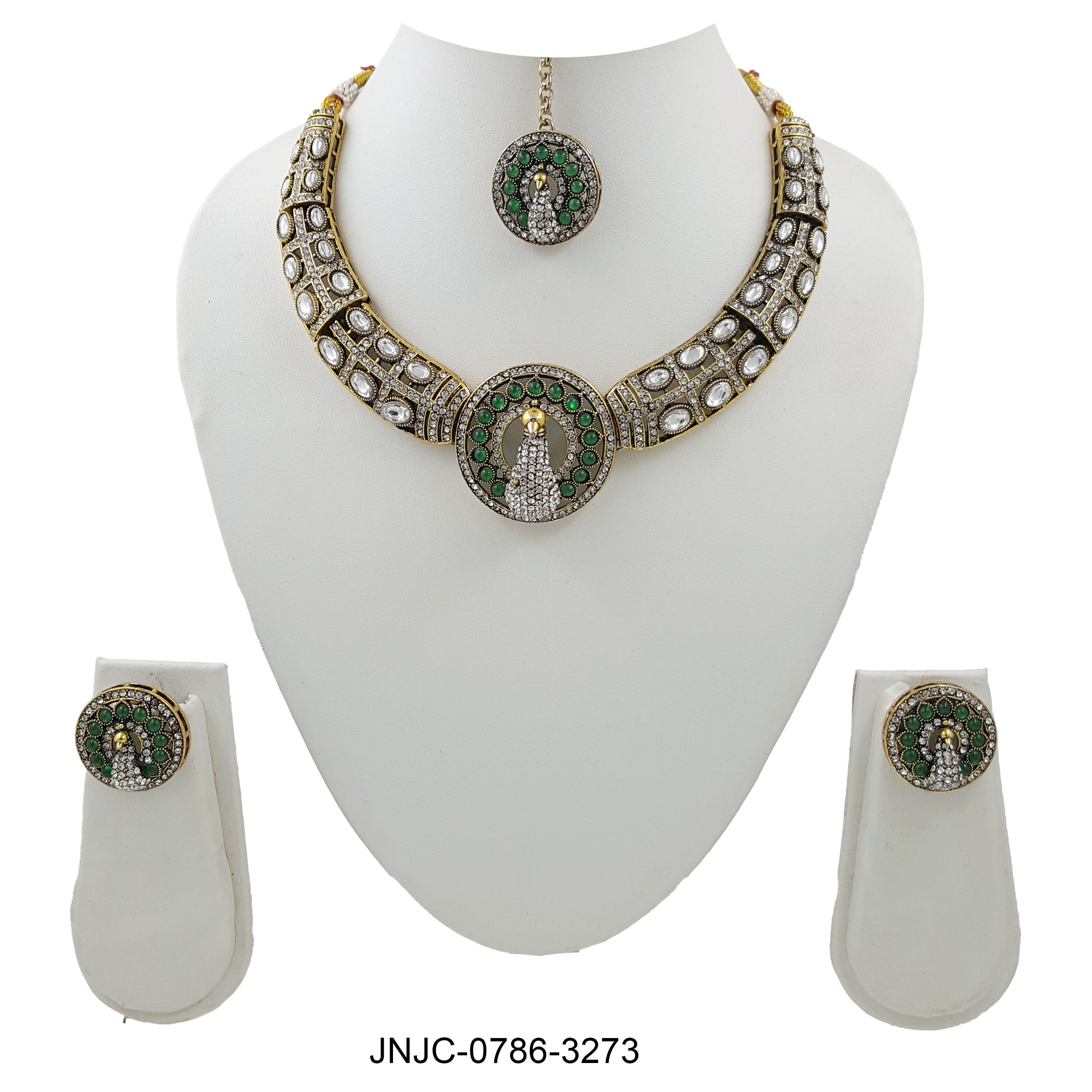 Regal Peacock Kundan Set – Emerald and White Stone Necklace with Matching Earrings and Maang Tikka