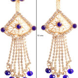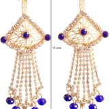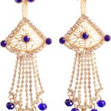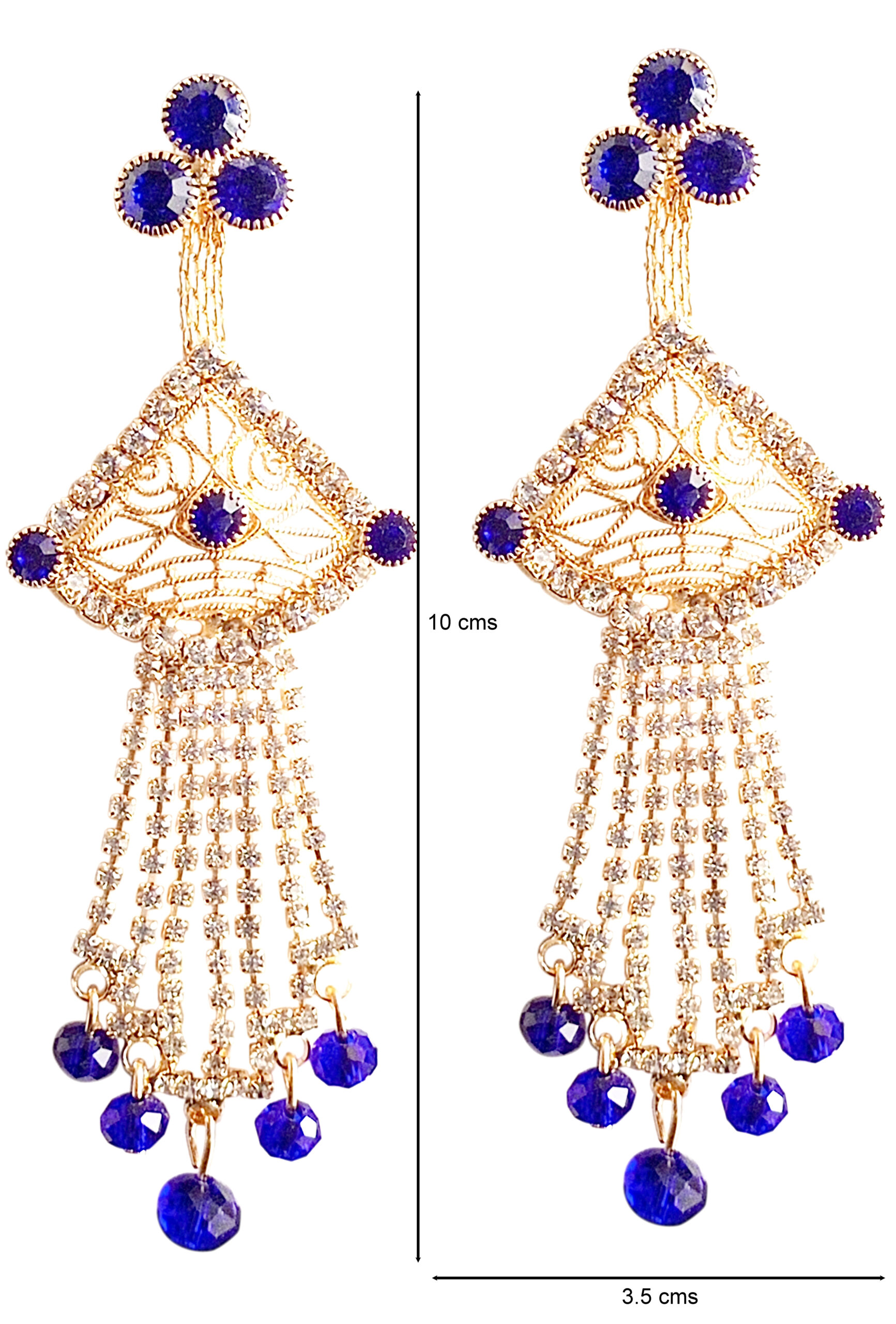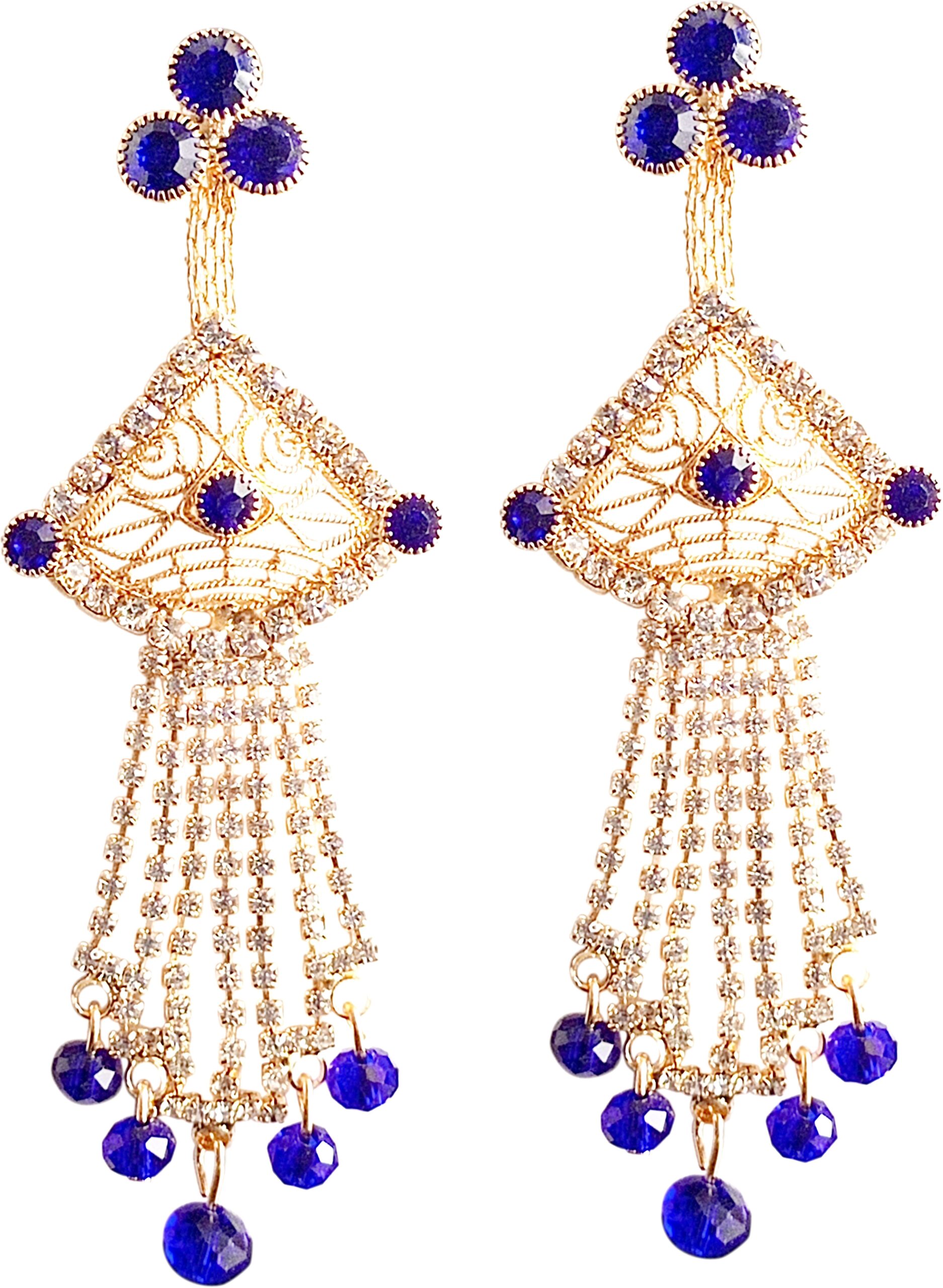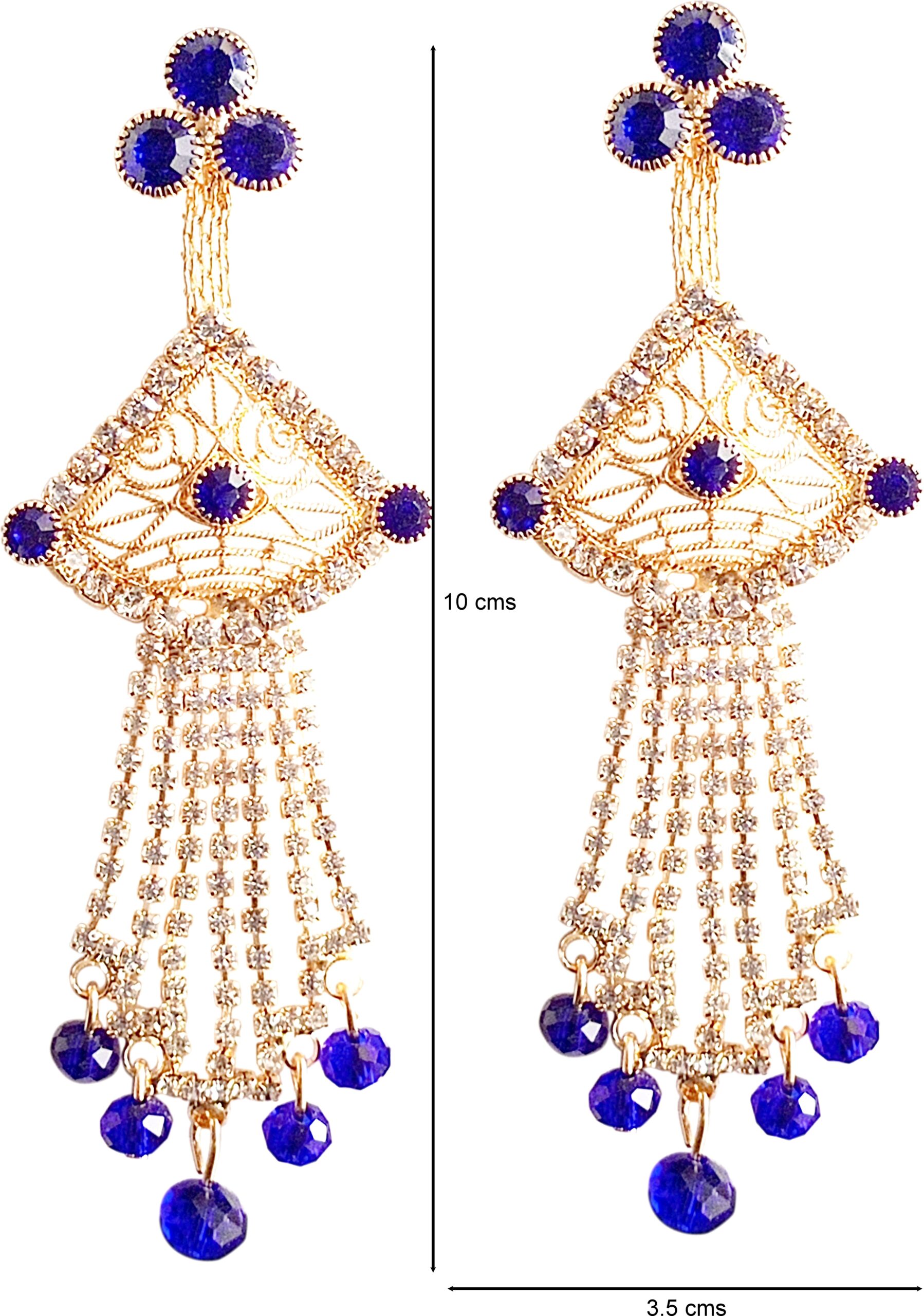 Make a graceful statement with these stunning Gold-Tone Chandelier Earrings adorned with rich royal blue stones and shimmering crystal chains. The delicate filigree fan-shaped top is framed with sparkling accents, while cascading strands finished with blue beads create beautiful movement and shine. Perfect for festive evenings, weddings, and special occasions, these earrings combine traditional elegance with a touch of modern glamour. Lightweight yet dramatic, they instantly elevate both ethnic and fusion outfits.