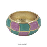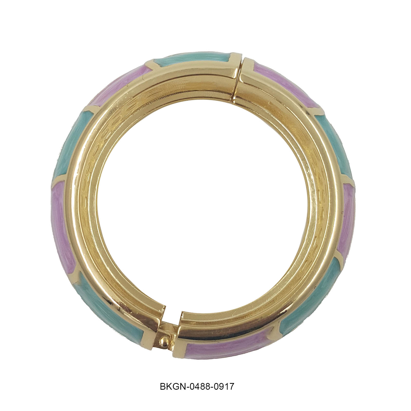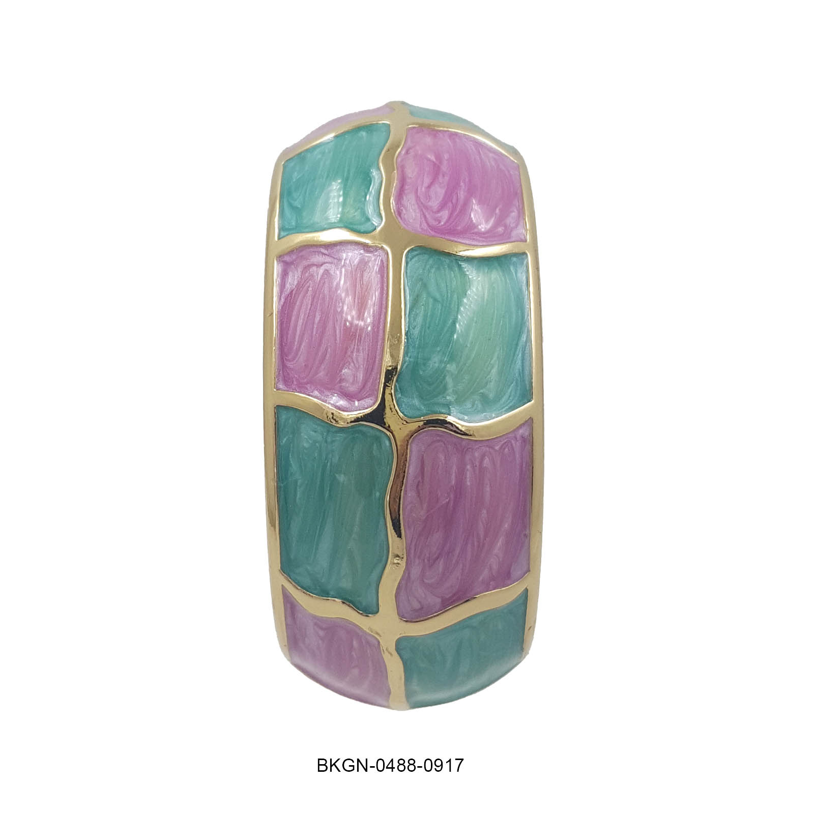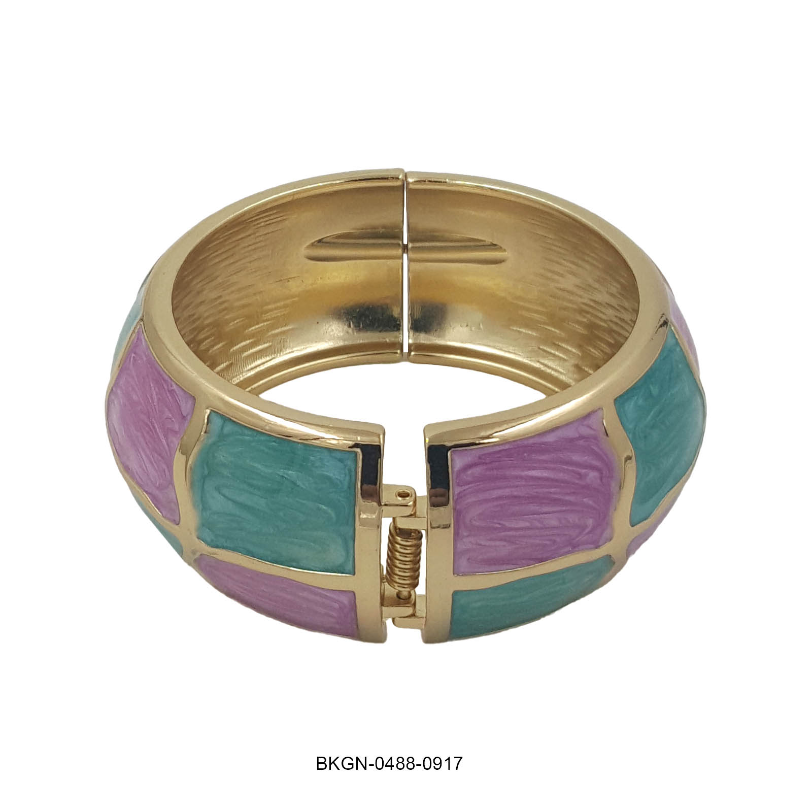 A vibrant statement kada bracelet designed with a playful mosaic of aqua green and lilac enamel tiles outlined in luxurious gold detailing. Its domed structure and textured gold interior ensure comfort while delivering a bold, eye-catching look. Perfect for anyone who loves colourful accessories that instantly brighten any outfit, this kada brings a fresh, youthful charm to your jewellery collection.