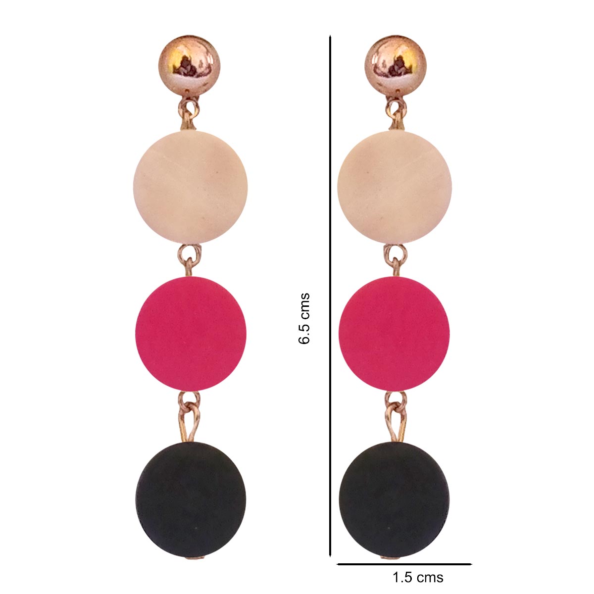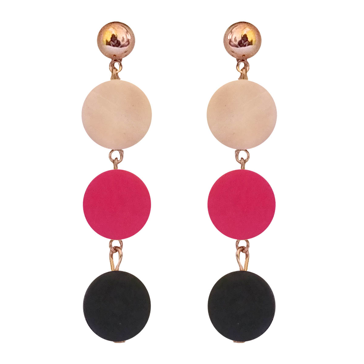 These elegant cascade drop earrings feature a beautiful blend of soft blush, vibrant berry pink, and deep black circular elements, finished with a polished rose-gold toned stud at the top. The matte textures paired with gentle movement create a modern yet feminine silhouette. Striking but balanced, these earrings add a pop of colour while remaining versatile for everyday and occasion wear.
