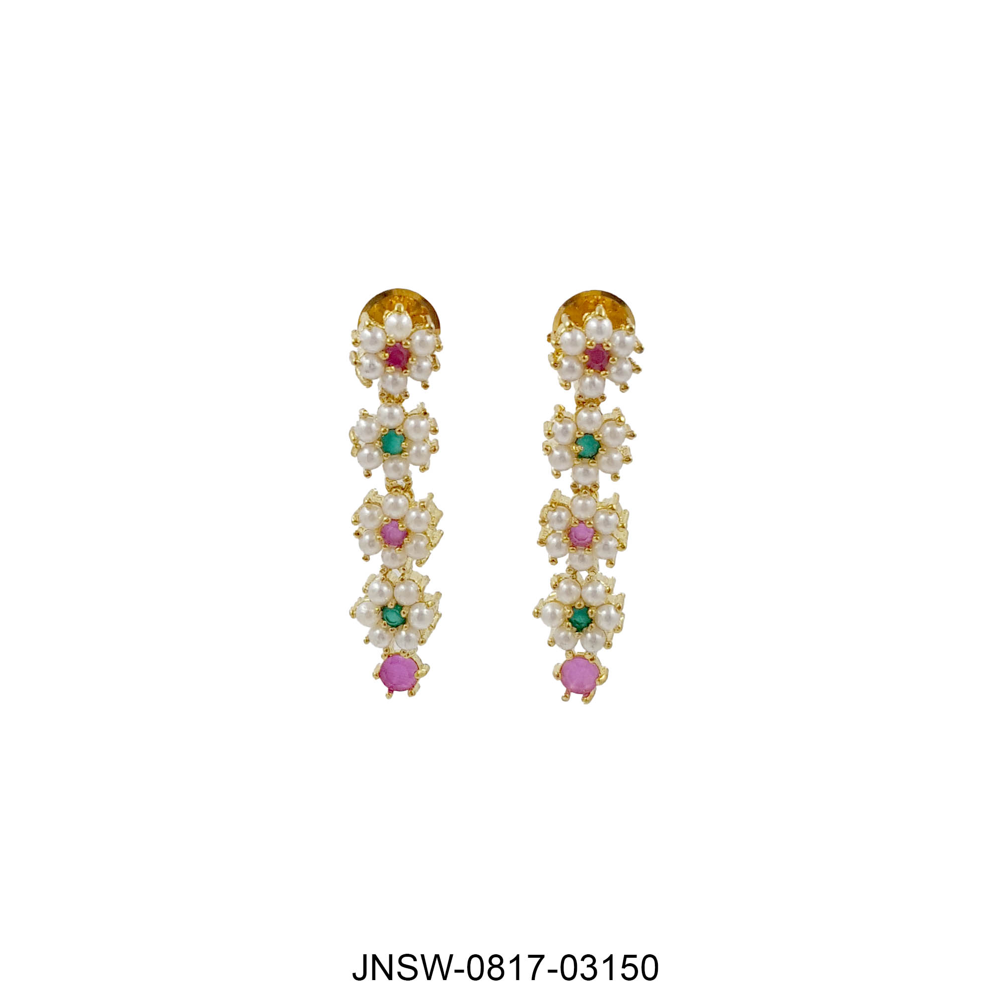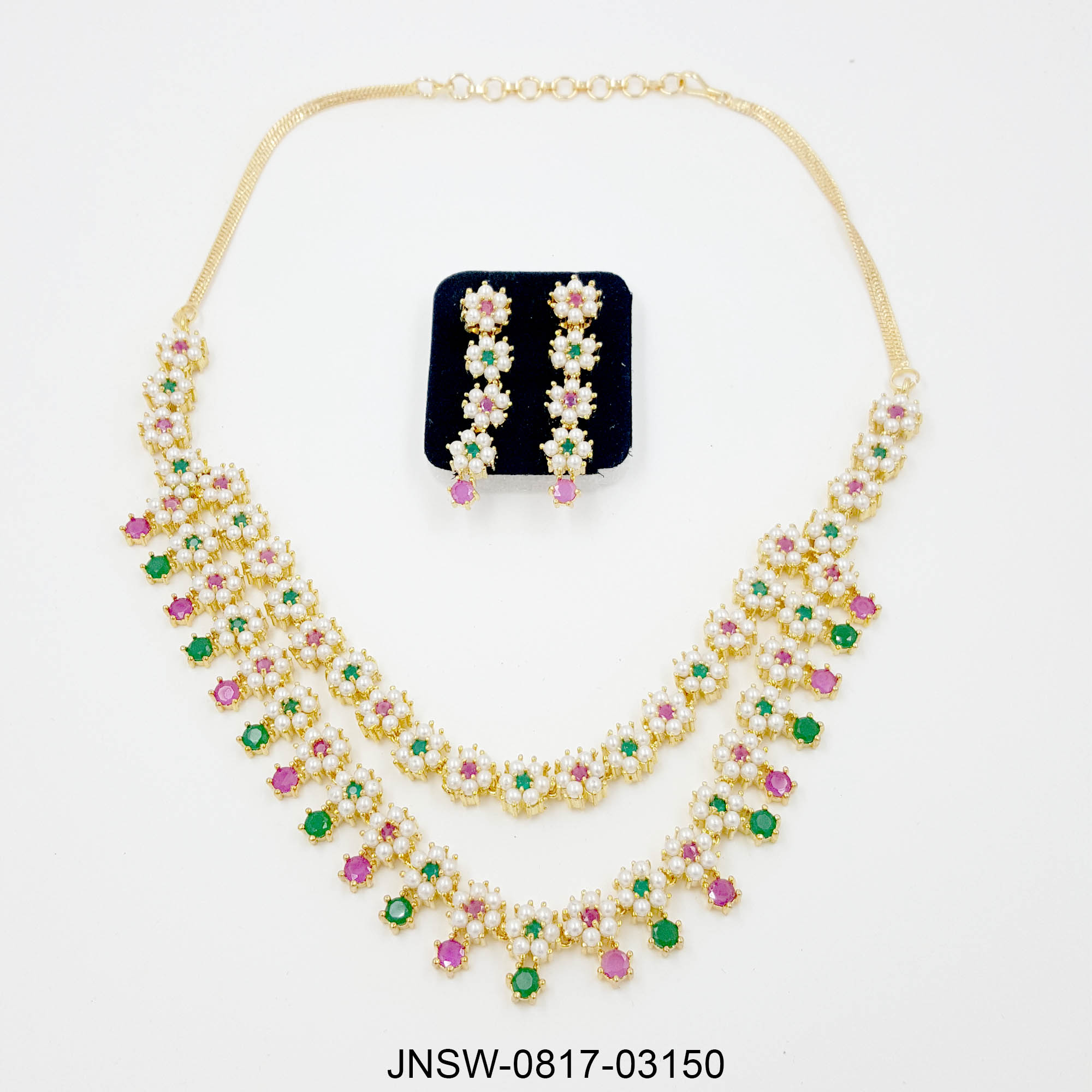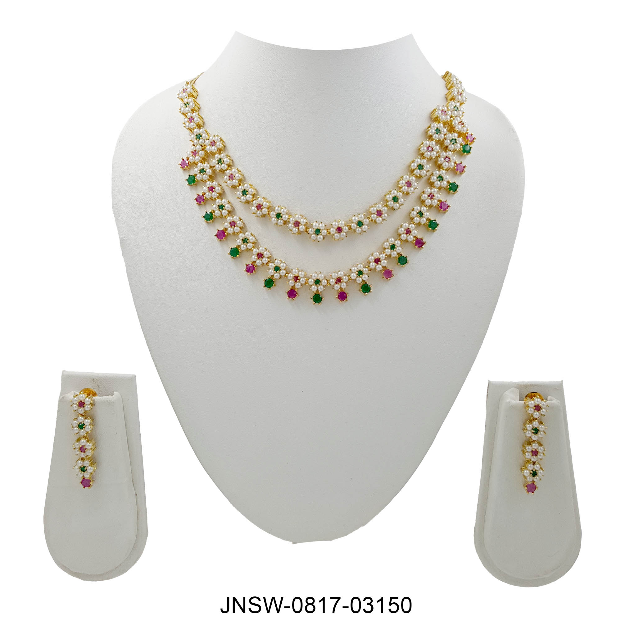Elevate your traditional look with this stunning layered necklace set, crafted with delicate pearl clusters and vibrant green–pink colourstones. The dual-layer floral design adds richness and dimension, making it a perfect choice for weddings, haldi–mehendi, pujas, and festive celebrations.