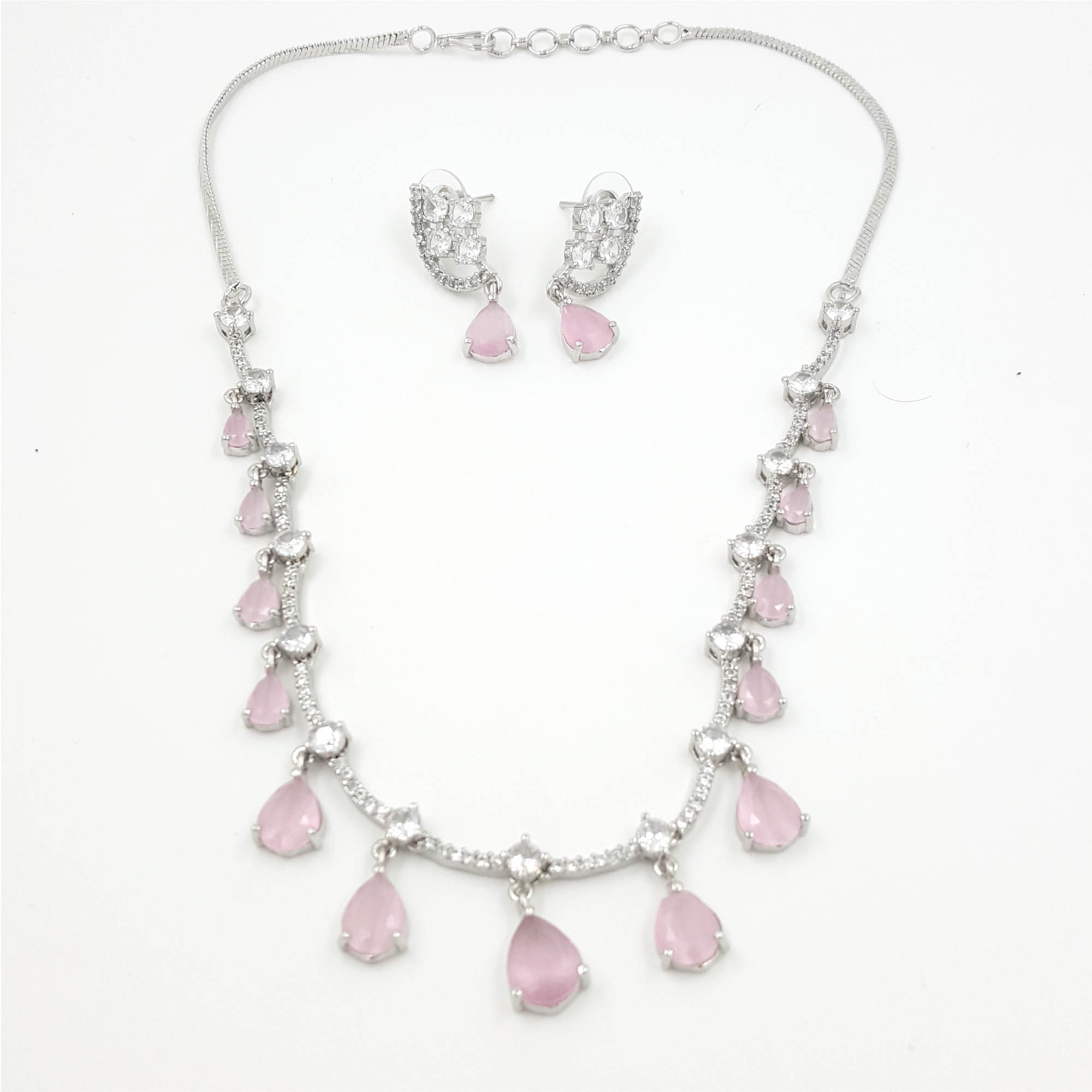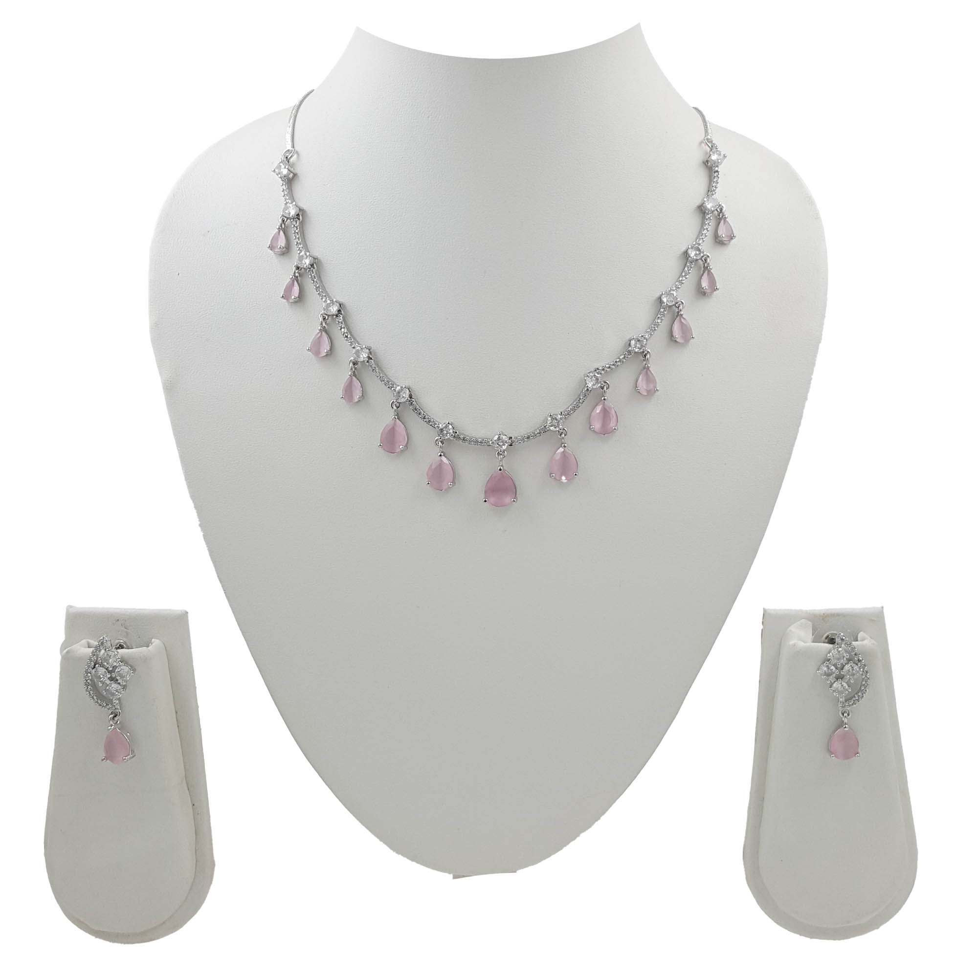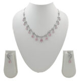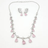Embrace subtle elegance with this Blush Pink Drop Necklace Set. Designed with soft pink teardrop stones and glimmering American diamonds on a sleek silver base, this set exudes femininity and grace. Perfect for day events or romantic evenings, it adds just the right touch of sparkle and sophistication to your look.
