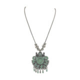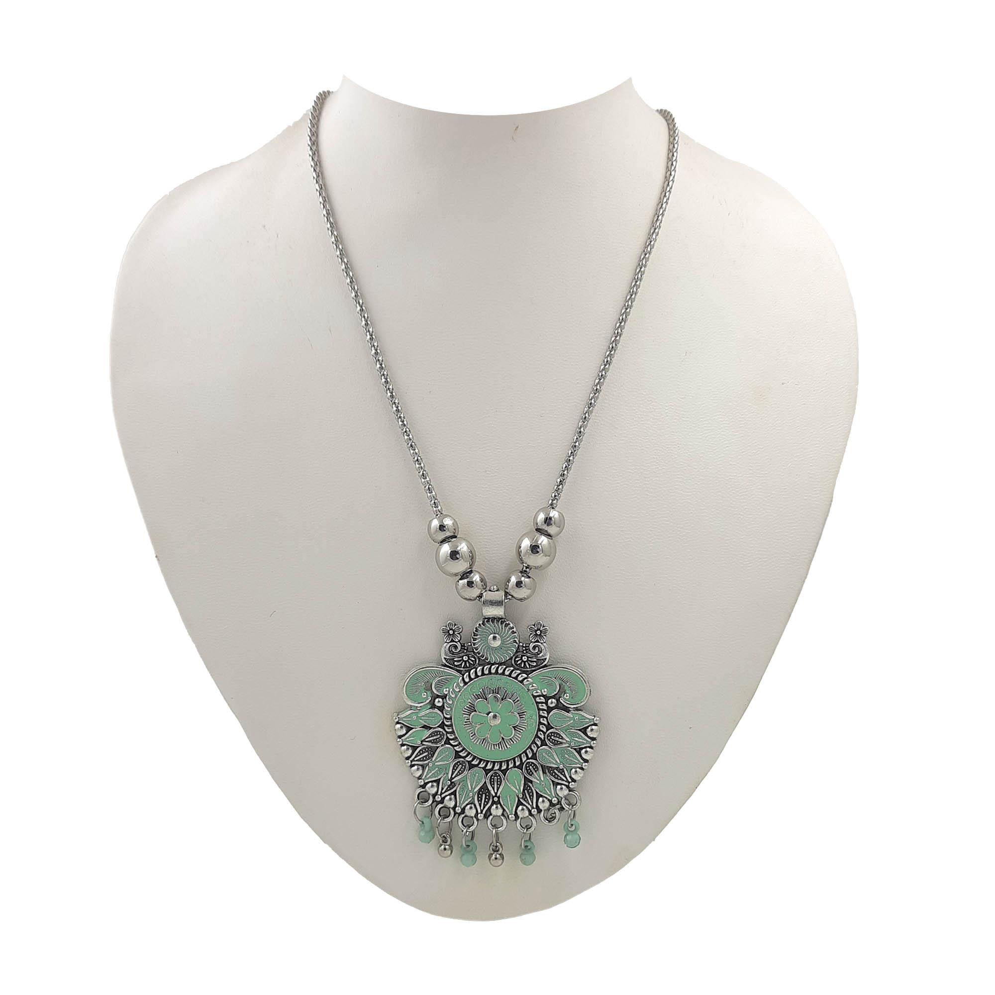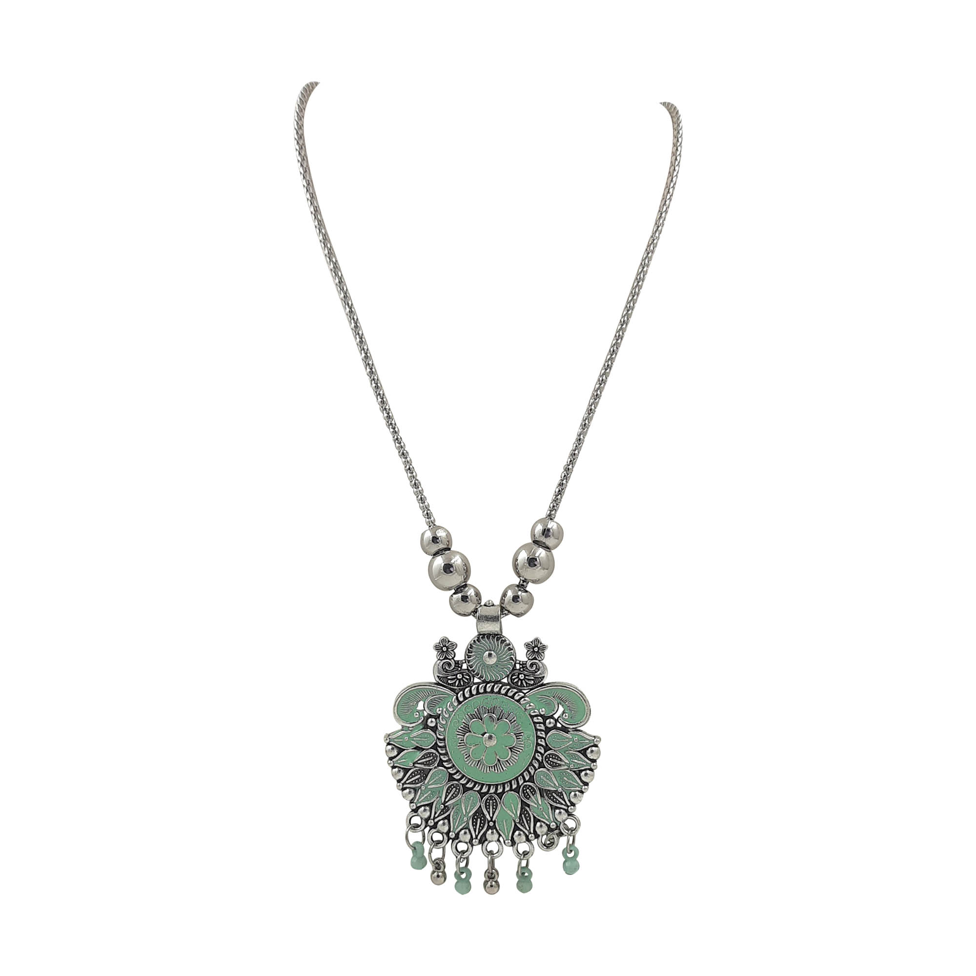 A beautifully crafted oxidized silver necklace featuring a round floral pendant with pastel green enamel accents and bead danglings. The detailed leaf-inspired design around the centerpiece adds a graceful ethnic charm.