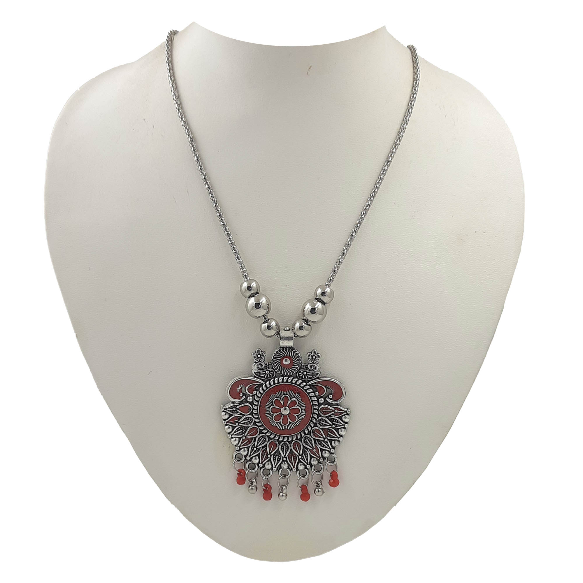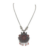 A beautifully crafted oxidized silver necklace featuring a round floral pendant with red enamel accents and bead danglings. The detailed leaf-inspired design around the centerpiece adds a graceful ethnic charm.