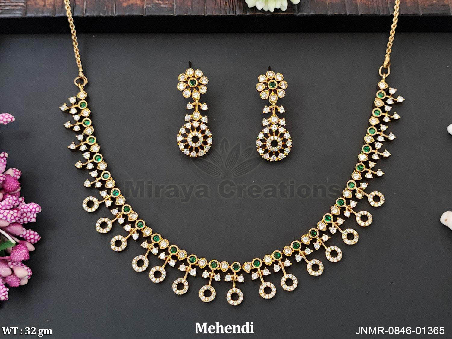 This graceful traditional necklace set features a delicate gold-tone base highlighted with sparkling white stones and rich emerald green accents. The evenly spaced circular drops add a soft festive movement, while the matching earrings mirror the same floral and circular detailing for a perfectly coordinated look. Lightweight and comfortable, this set is ideal for mehndi ceremonies, daytime wedding functions, and festive celebrations where elegance meets ease. A timeless design that blends traditional charm with a modern finish.