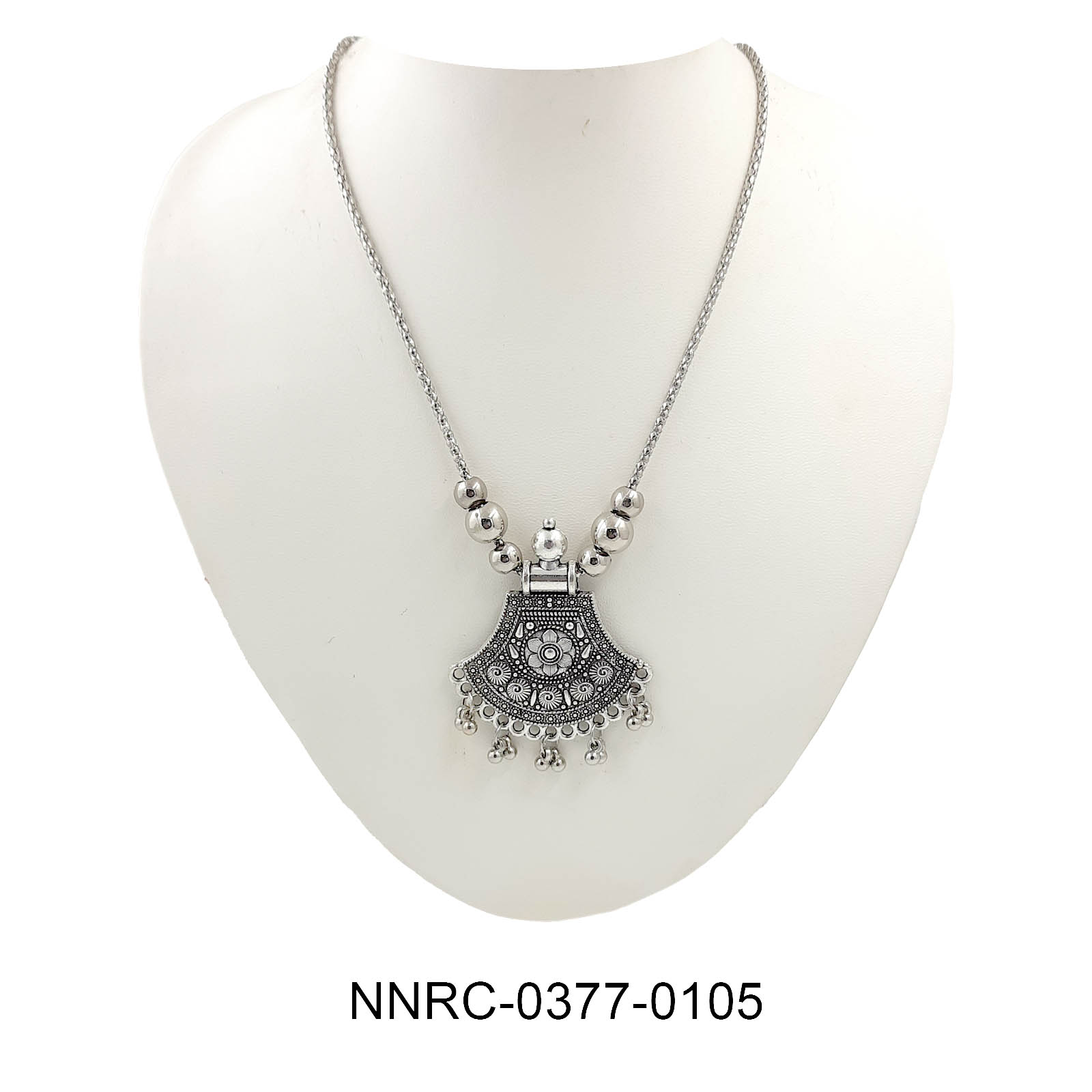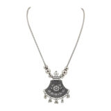 A timeless oxidised silver necklace featuring a half-moon pendant with intricate detailing and delicate ghungroo danglers. Perfect for adding an ethnic touch to any look.