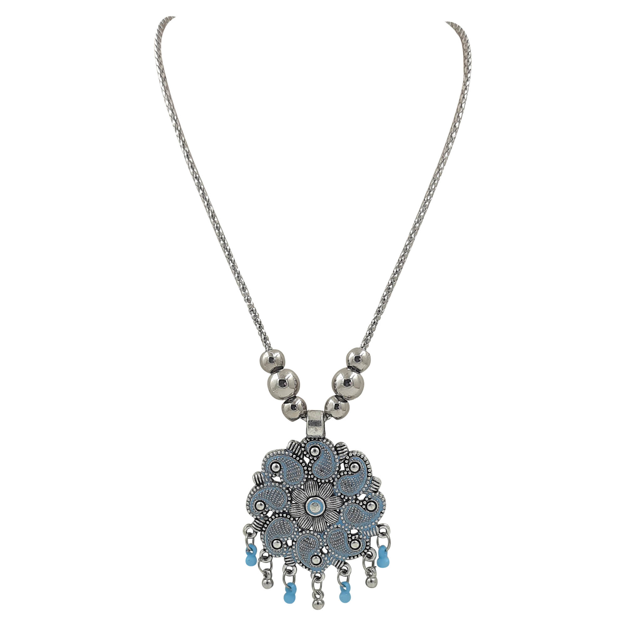 A bold oxidized silver necklace with a floral-inspired pastel blue pendant, enhanced with bead danglings. The light blue accents make it perfect for festive occasions and traditional wear.