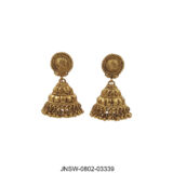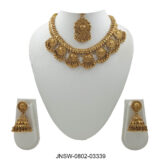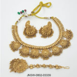 An opulent antique gold choker set inspired by traditional temple jewellery craftsmanship, featuring richly carved coin motifs, intricate bead clusters, and a statement pendant. Paired with matching jhumki earrings, this set exudes heritage charm and makes a bold, regal addition to festive and bridal wardrobes. Perfect for those who love classic, culturally rooted gold-toned jewellery.