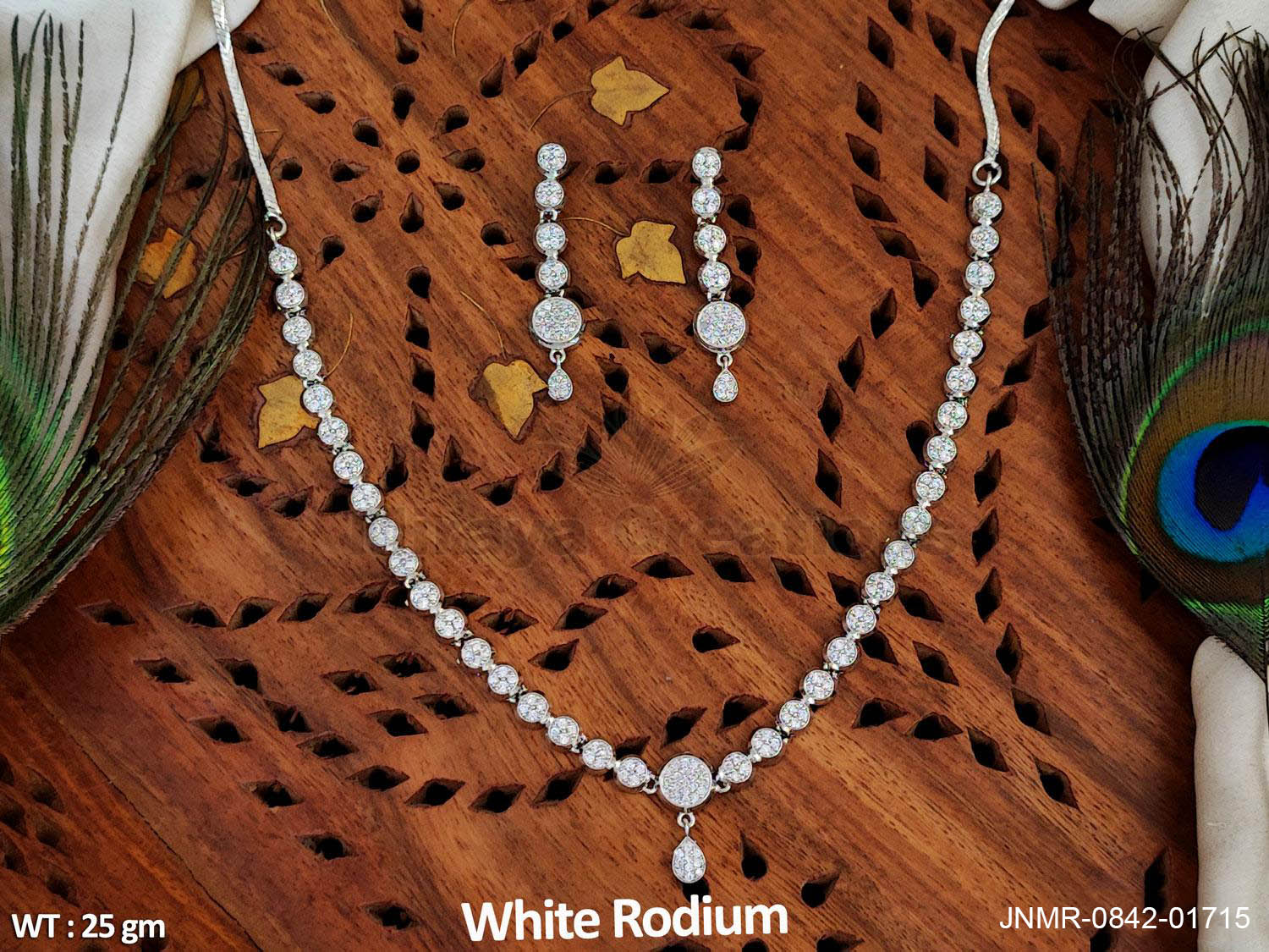 This graceful white rhodium necklace set features a timeless line design embellished with sparkling diamond-look stones. The centrally placed round motif with a subtle drop adds refined elegance, while the matching earrings mirror the same clean and classic detailing. Lightweight and comfortable, this set is perfect for weddings, receptions, festive occasions, and formal celebrations. Its versatile design makes it a must-have piece for those who love understated luxury with a traditional touch.