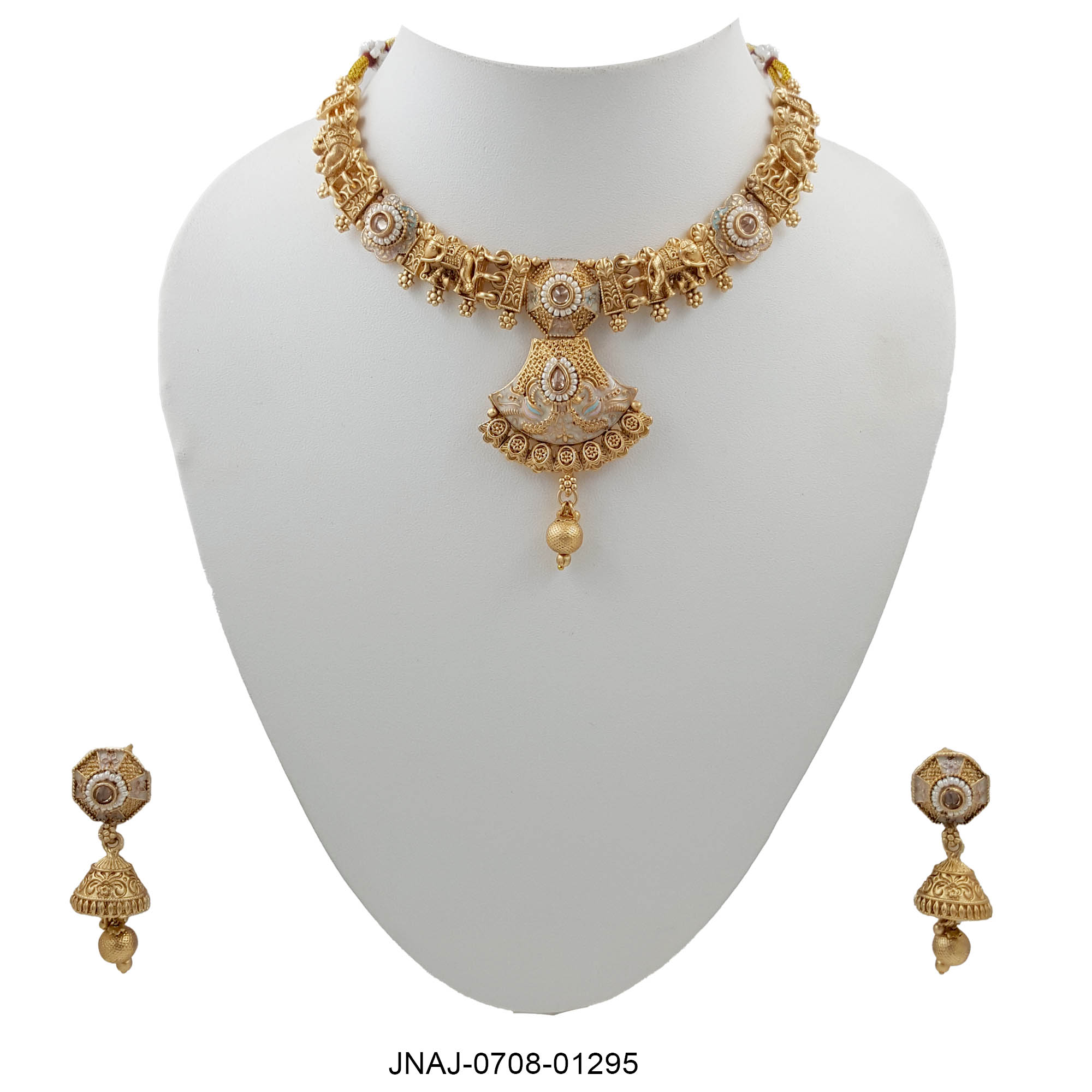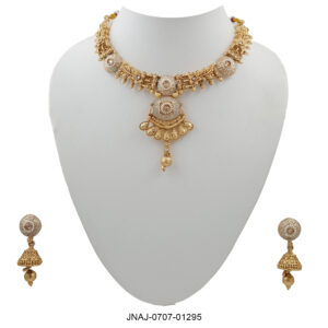 Crafted in antique gold with intricate temple motifs and a fan-shaped pendant, this set is highlighted by pear-shaped white stones and soft ivory enamel. The earrings mirror the bold yet graceful design, making this set a celebration of traditional craftsmanship.