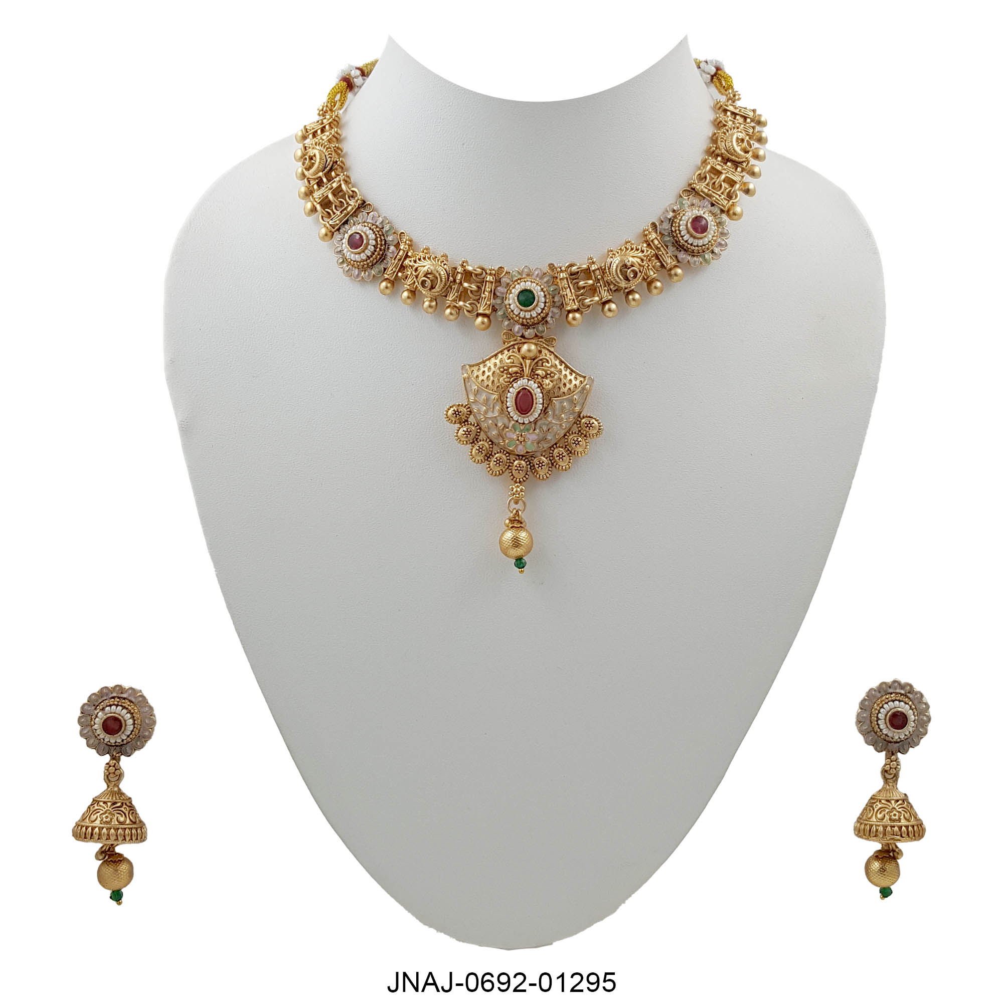Embrace timeless tradition with this intricately crafted gold design necklace set, featuring antique gold tones, delicate pearl edging, and a central Lakshmi-inspired pendant. Accented with green and red stones and paired with elegant jhumkis, this set brings divine beauty and regal charm to any ethnic ensemble. Perfect for festive and bridal occasions, it echoes the richness of South Indian craftsmanship.
