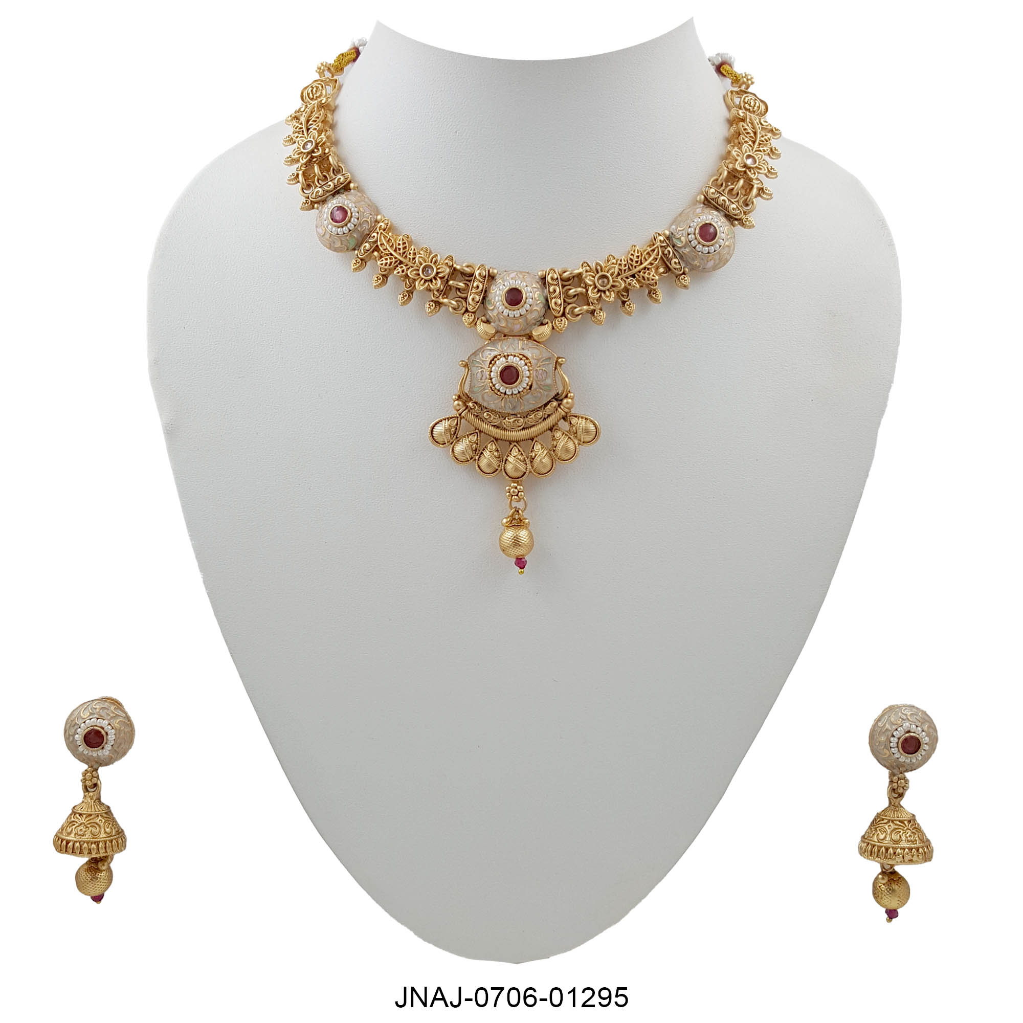 A radiant blend of tradition and elegance, this antique gold necklace set is adorned with lotus petal motifs, ruby red center stones, and a beautifully layered pendant. The intricate detailing and jhumka earrings make it a perfect choice for special occasions steeped in heritage.