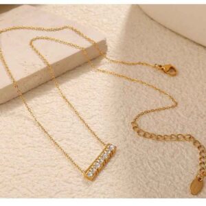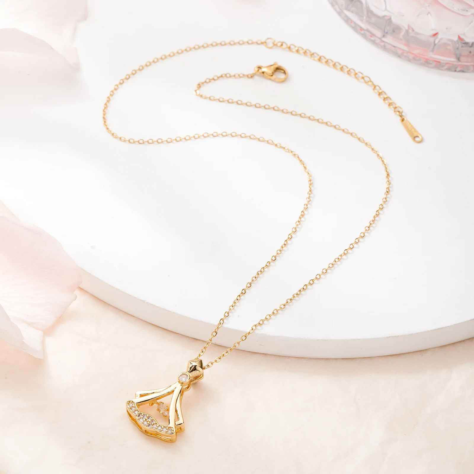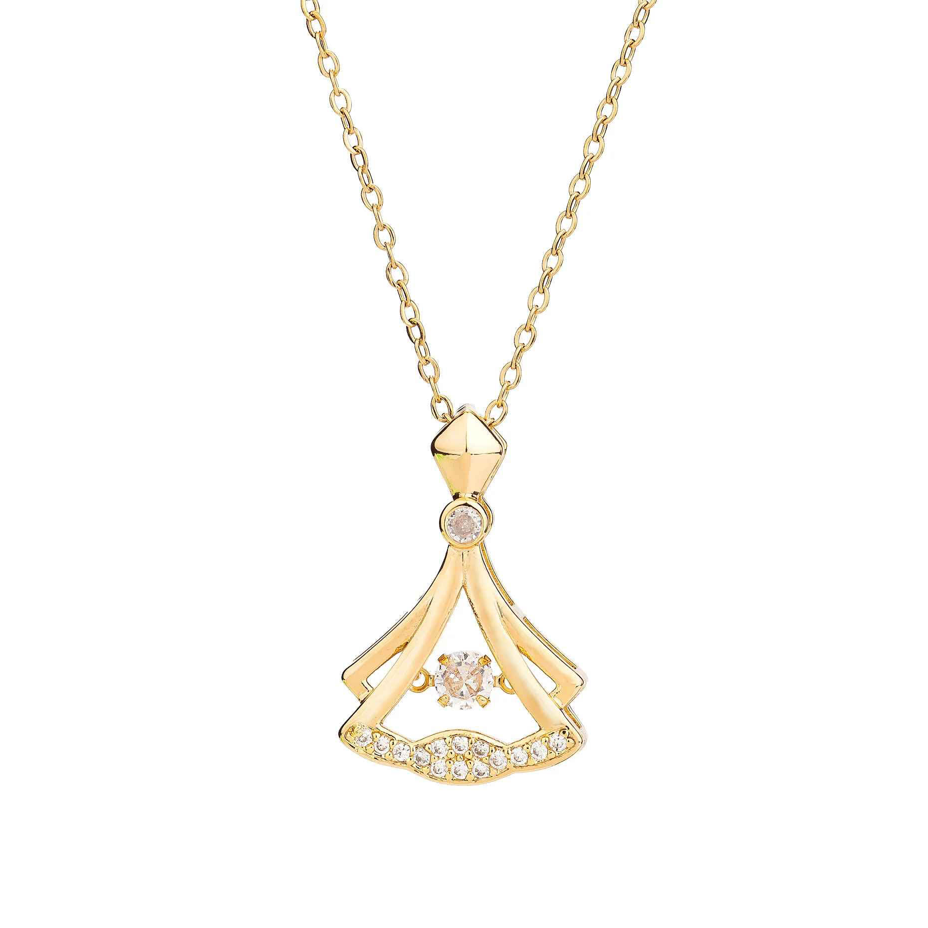 A beautifully crafted gold-plated pendant inspired by a fan-shaped silhouette, adorned with sparkling cubic zirconia stones. The delicate design features a central shimmering stone that adds depth and luxury to the piece. Lightweight, refined, and modern, this necklace brings a touch of sophistication to any look—perfect for daily wear, special occasions, or gifting someone special.