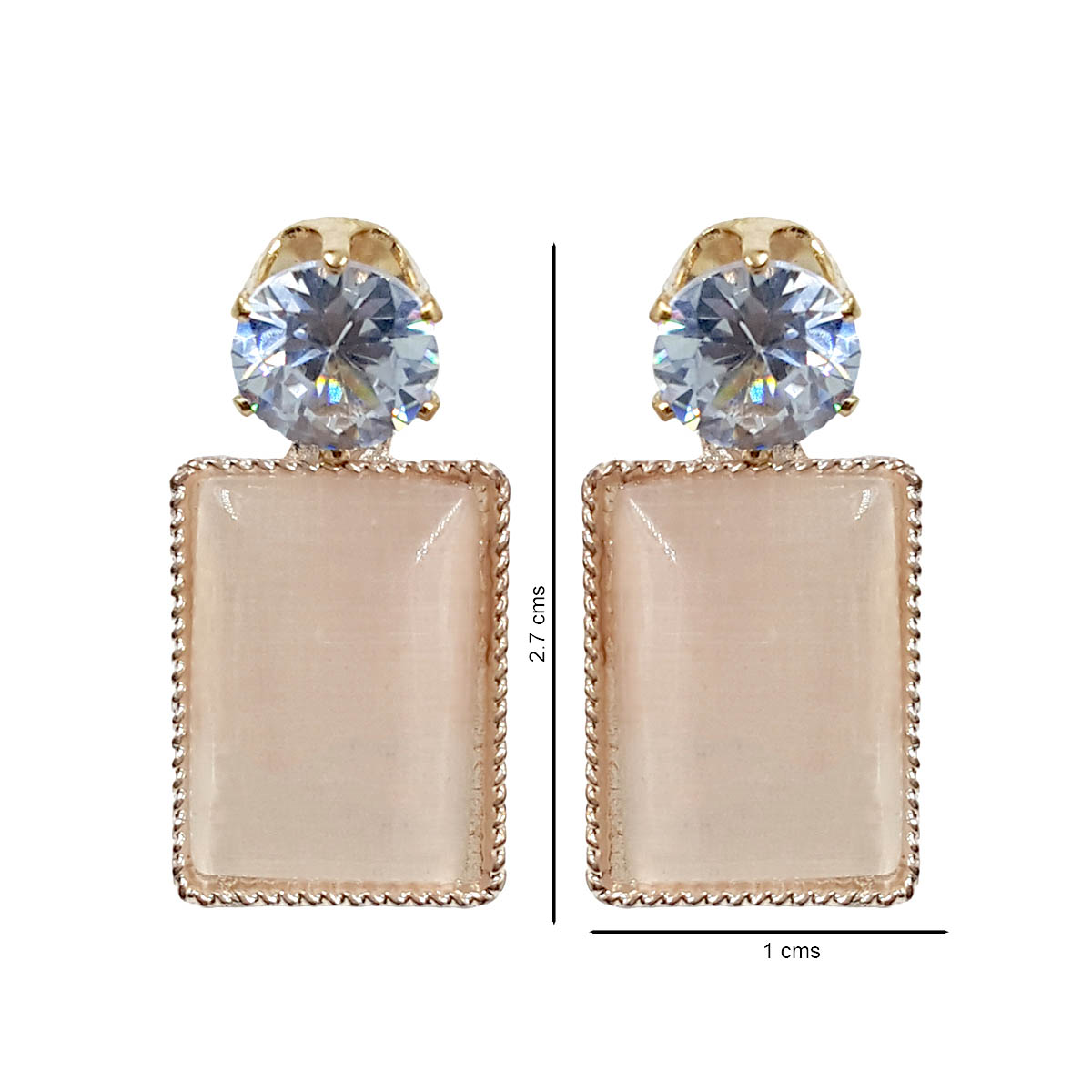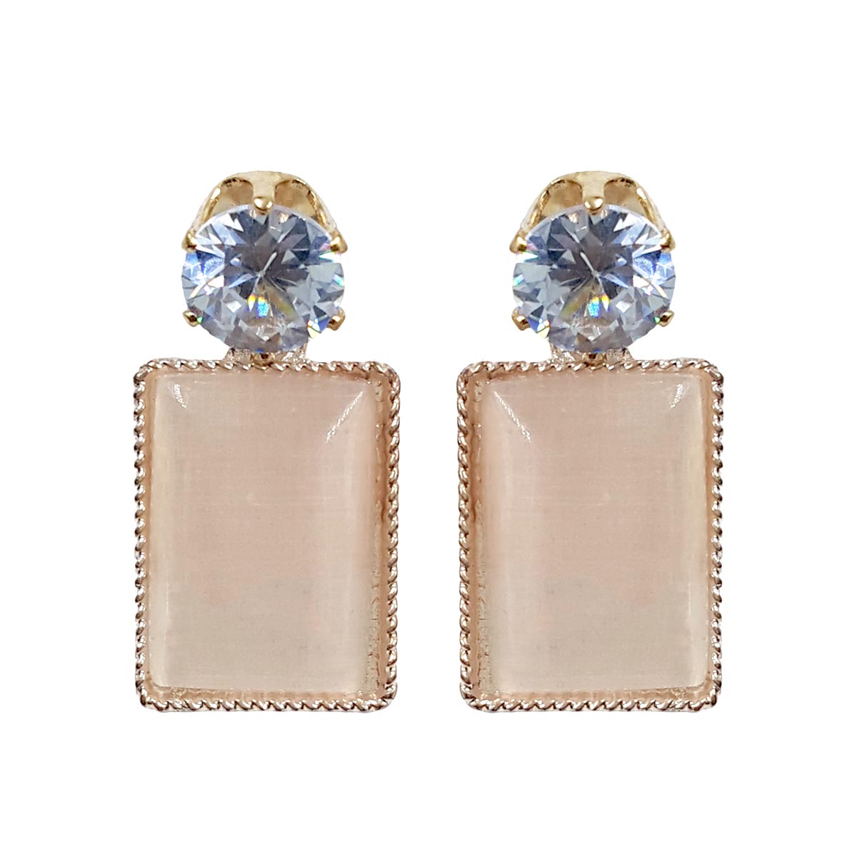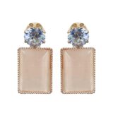 These sophisticated drop earrings feature a brilliant round crystal stud paired with a smooth rectangular stone framed by a delicate metallic border. The clean lines of the rectangular drop combined with the soft, luminous finish create a modern yet timeless appeal. Designed to be lightweight and comfortable, these earrings bring understated elegance to both everyday and occasion looks.