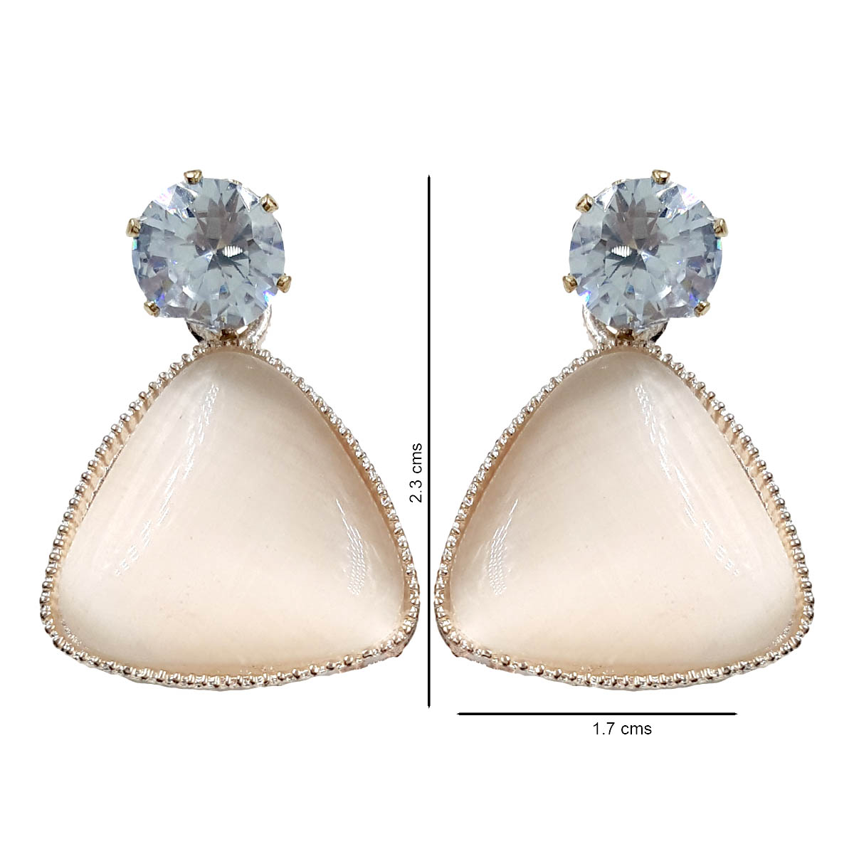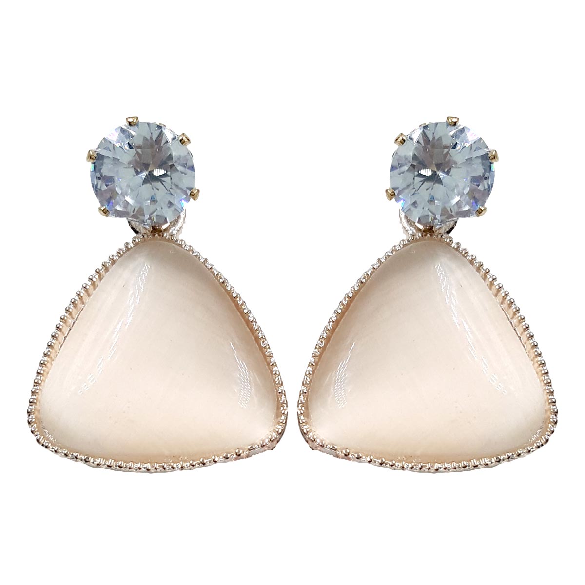 These sophisticated drop earrings feature a radiant round crystal stud paired with a smooth, softly contoured triangular stone drop. Framed with a delicate metallic edge, the subtle sheen of the stone beautifully contrasts with the sparkle of the crystal, creating a refined and graceful silhouette. Lightweight and versatile, these earrings add understated elegance to both everyday and occasion wear.
