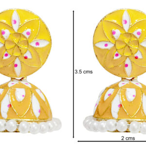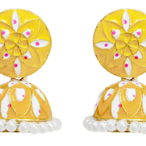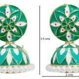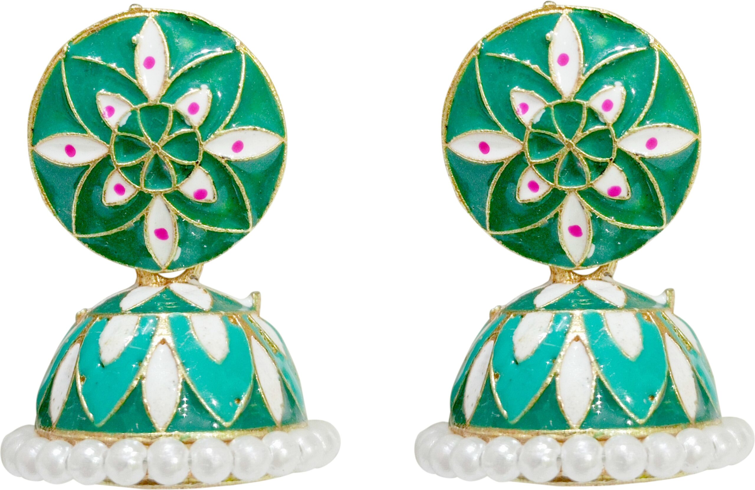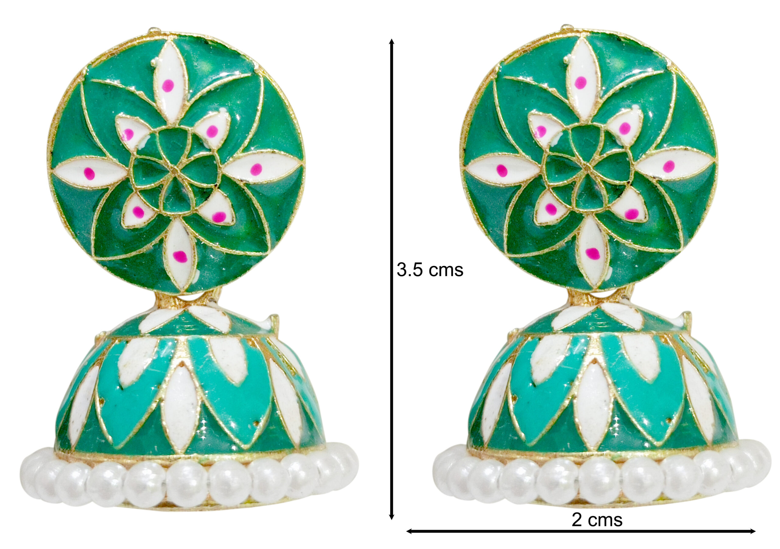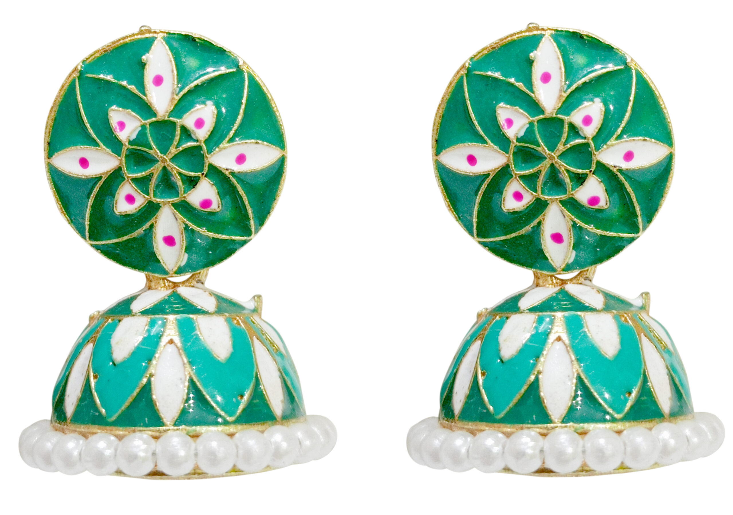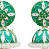 These emerald green enamel floral jhumki earrings are rich, vibrant, and perfect for ethnic celebrations. The round floral stud is hand-painted with intricate enamel detailing and flows into a matching dome jhumki below. Finished with soft pearl edging and gold-tone outlines, they feel regal yet easy to wear. The deep green shade adds depth and contrast to any outfit. A timeless piece for weddings, festivals, and special occasions.