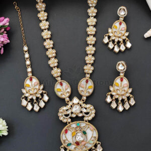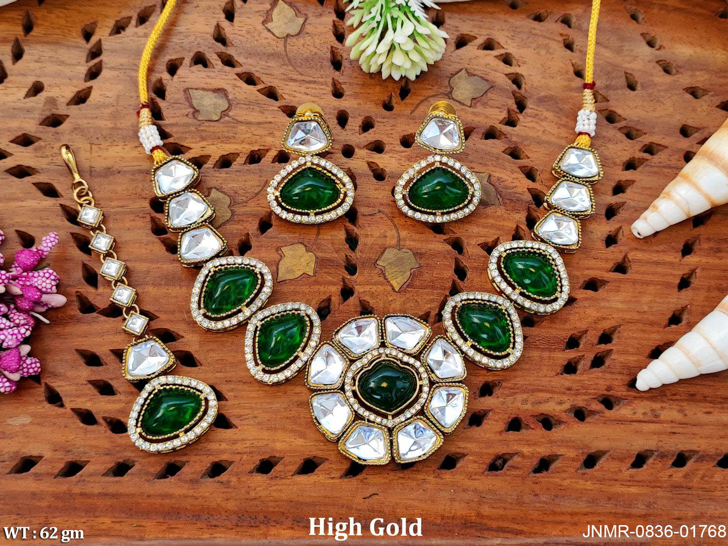 This exquisite traditional jewellery set features a stunning high-gold finish adorned with classic Kundan Polki work and rich emerald-green stones. The floral-inspired central pendant is beautifully highlighted with hand-set Polki stones, creating a regal and timeless appeal. Paired with matching earrings, this handcrafted set reflects royal Indian craftsmanship, making it a perfect choice for weddings, festive celebrations, and special occasions. Lightweight yet statement-worthy, it blends tradition with elegance effortlessly.
