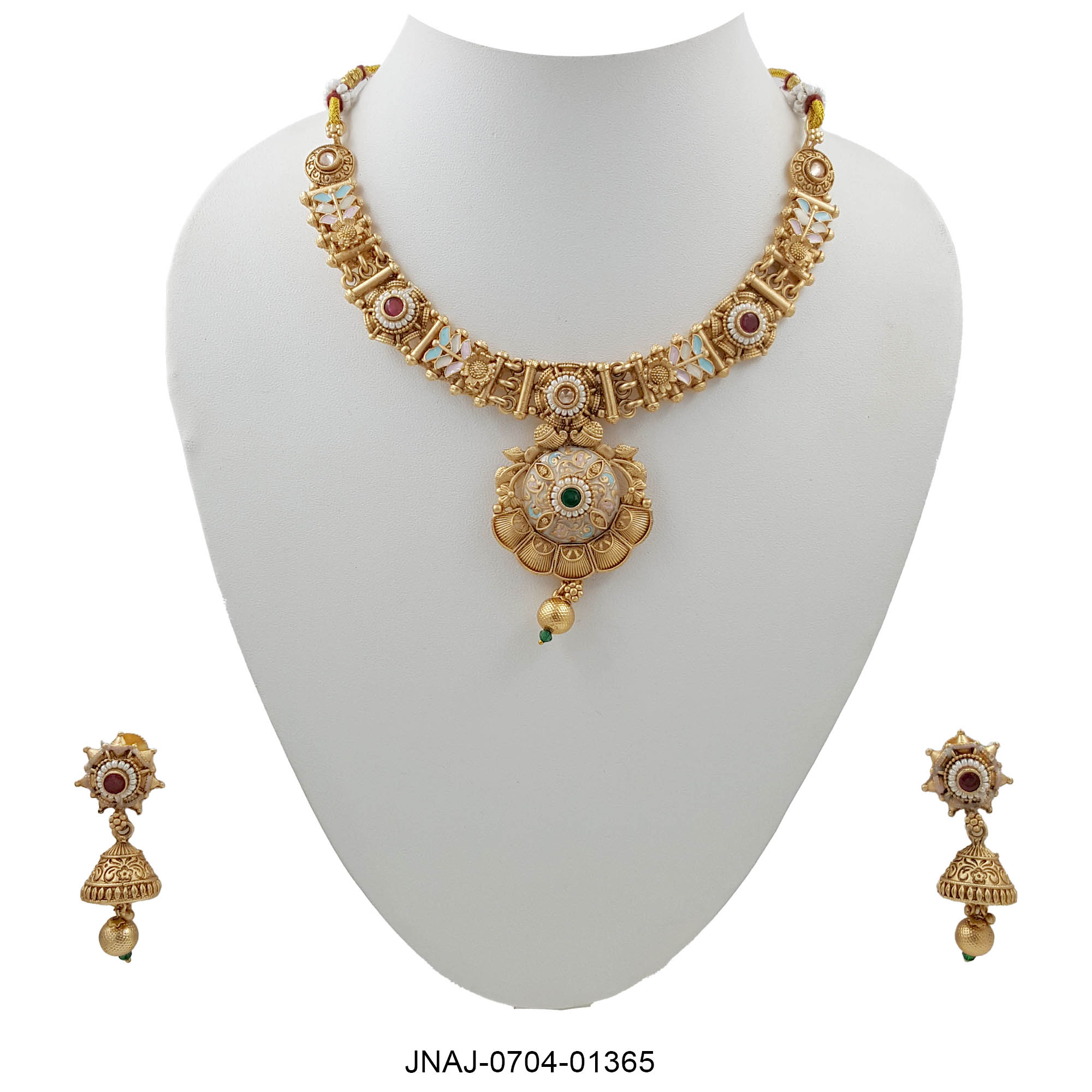 This exquisite antique gold necklace set showcases a floral pendant adorned with a striking emerald-green centerpiece. Surrounded by pastel enamel work and rich traditional textures, it blends vintage aesthetics with festive allure. The set includes complementing jhumka earrings that enhance the overall elegance — perfect for grand celebrations.