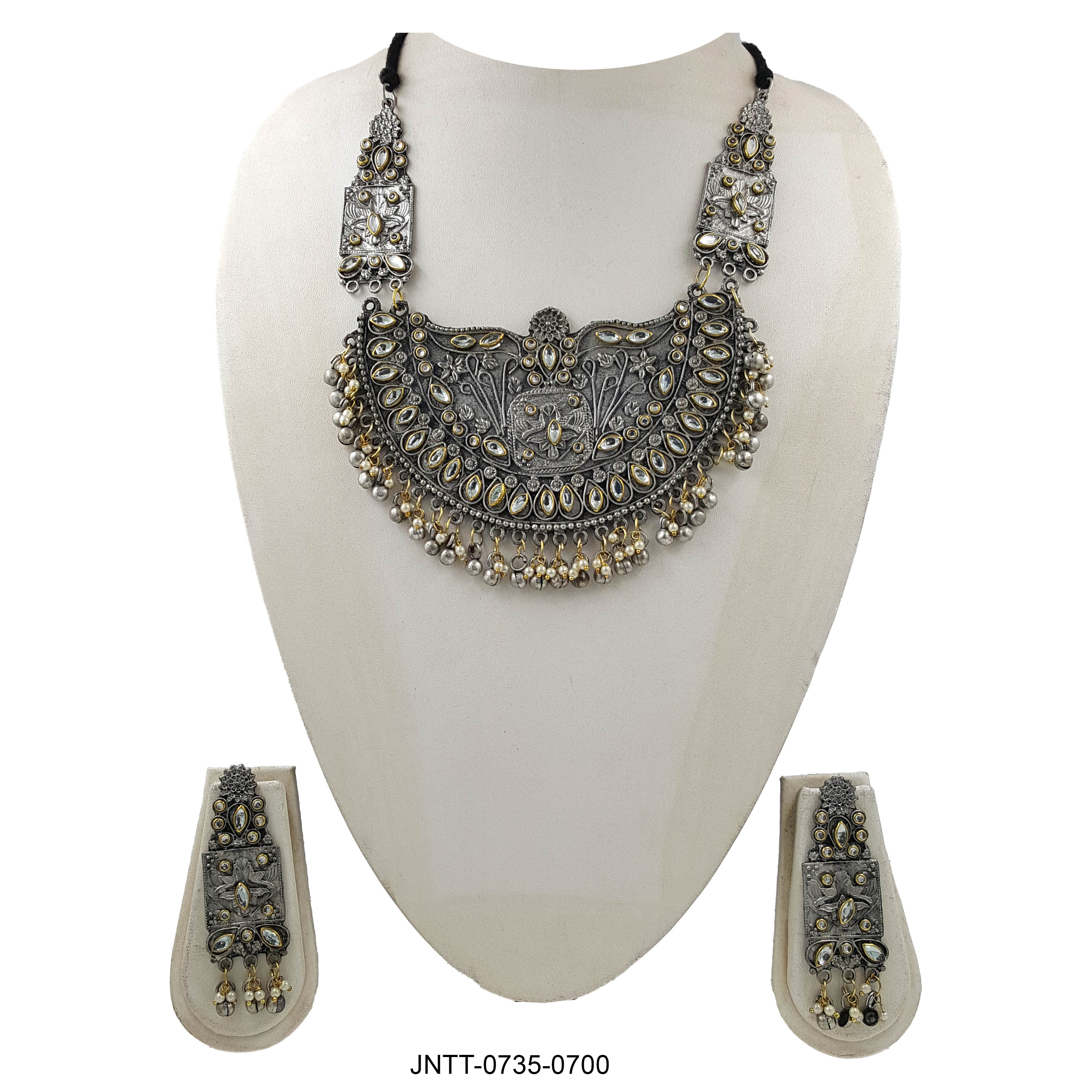 Get ready to slay every dandiya night with this head-turning tribal necklace set featuring green mirror accents, intricate oxidised motifs, and playful chain drops. Designed to move with your rhythm, this piece brings unmatched drama, energy, and boho flair to your Navratri wardrobe. A true celebration of craftsmanship and culture!