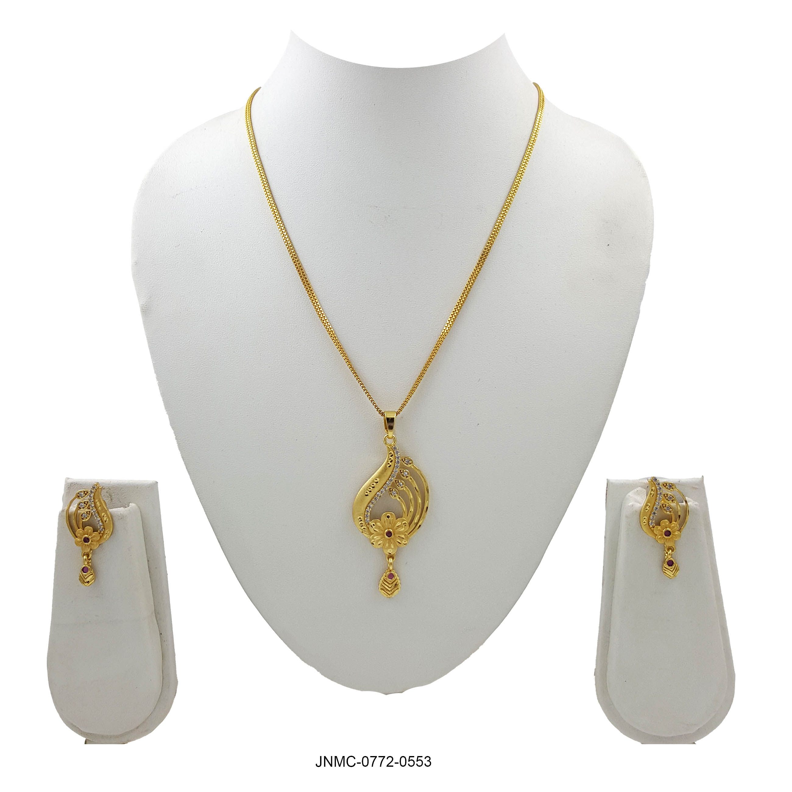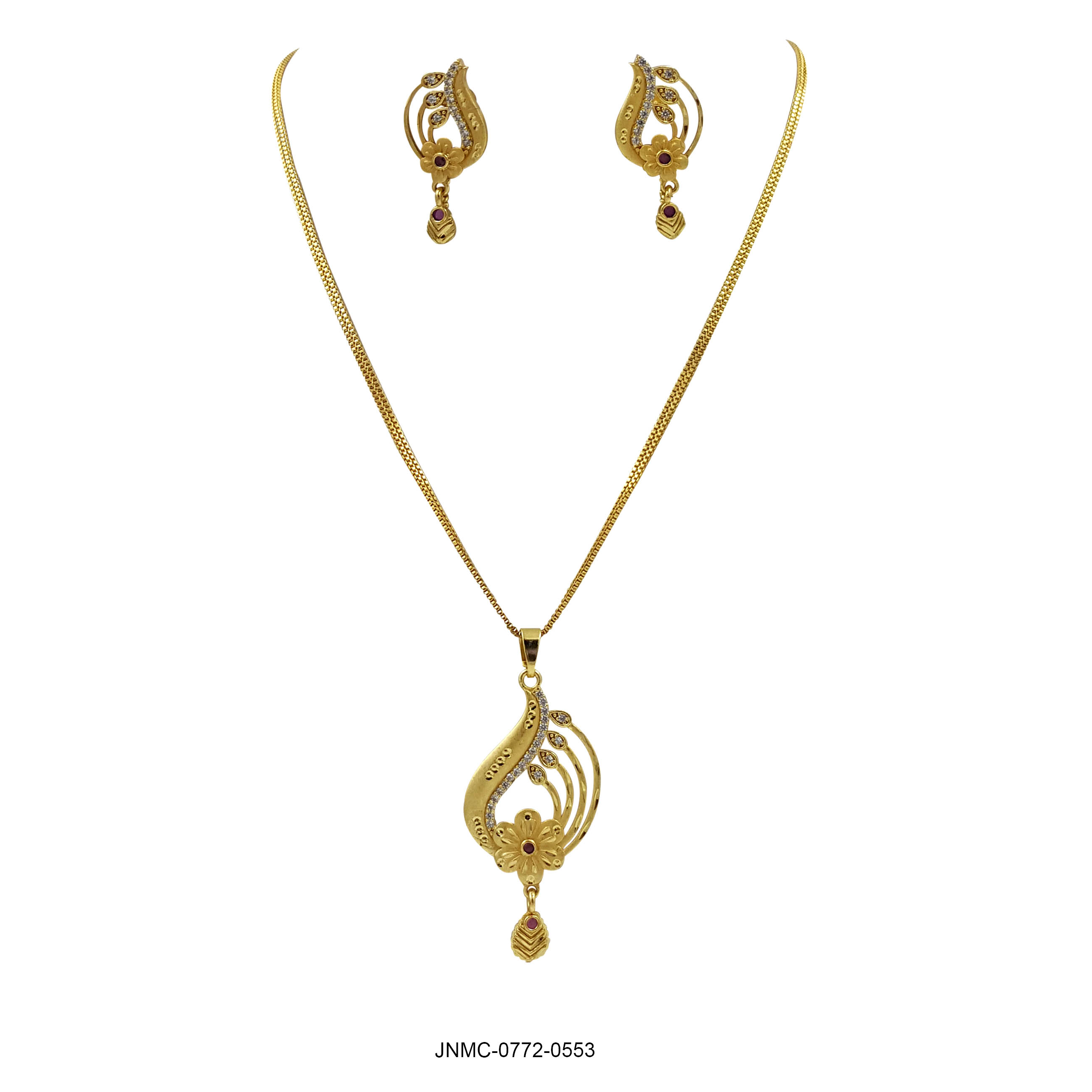 This pendant set features a striking geometric diamond-shaped design with intricate cutwork and subtle accents. The artistic detailing adds depth and texture, while the dangling drop element with a hint of red enhances its charm. Paired with matching earrings, this set brings a bold yet graceful look, perfect for women who love statement jewelry.
