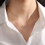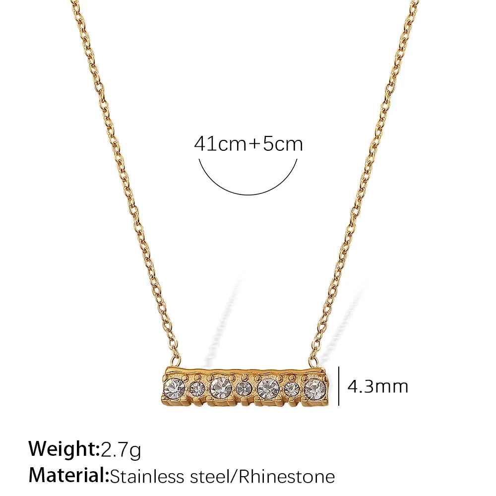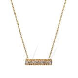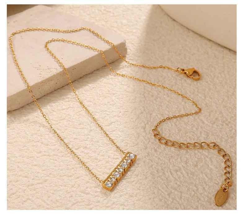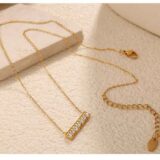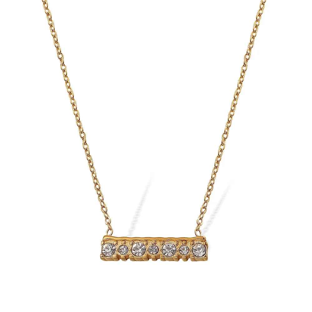 A sleek and minimal gold-plated bar pendant necklace adorned with a row of shimmering stones. Its clean linear design adds a touch of modern sophistication, making it a perfect everyday accessory. Lightweight, classy, and versatile—this piece brings just the right amount of sparkle to both casual and dressy outfits. Ideal for gifting or building a timeless jewellery collection.