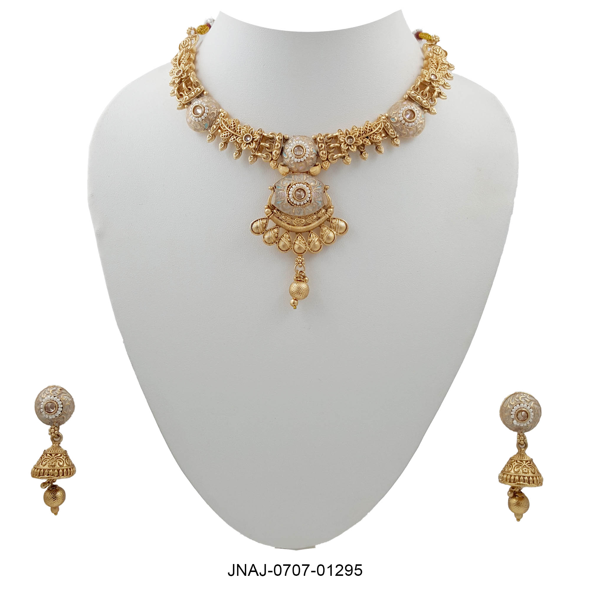 This graceful antique gold necklace set features muted ivory enamel highlights and circular motifs, exuding timeless charm. The elegant pendant with petal patterns and jhumka-style earrings make it ideal for those who appreciate subtle grandeur.