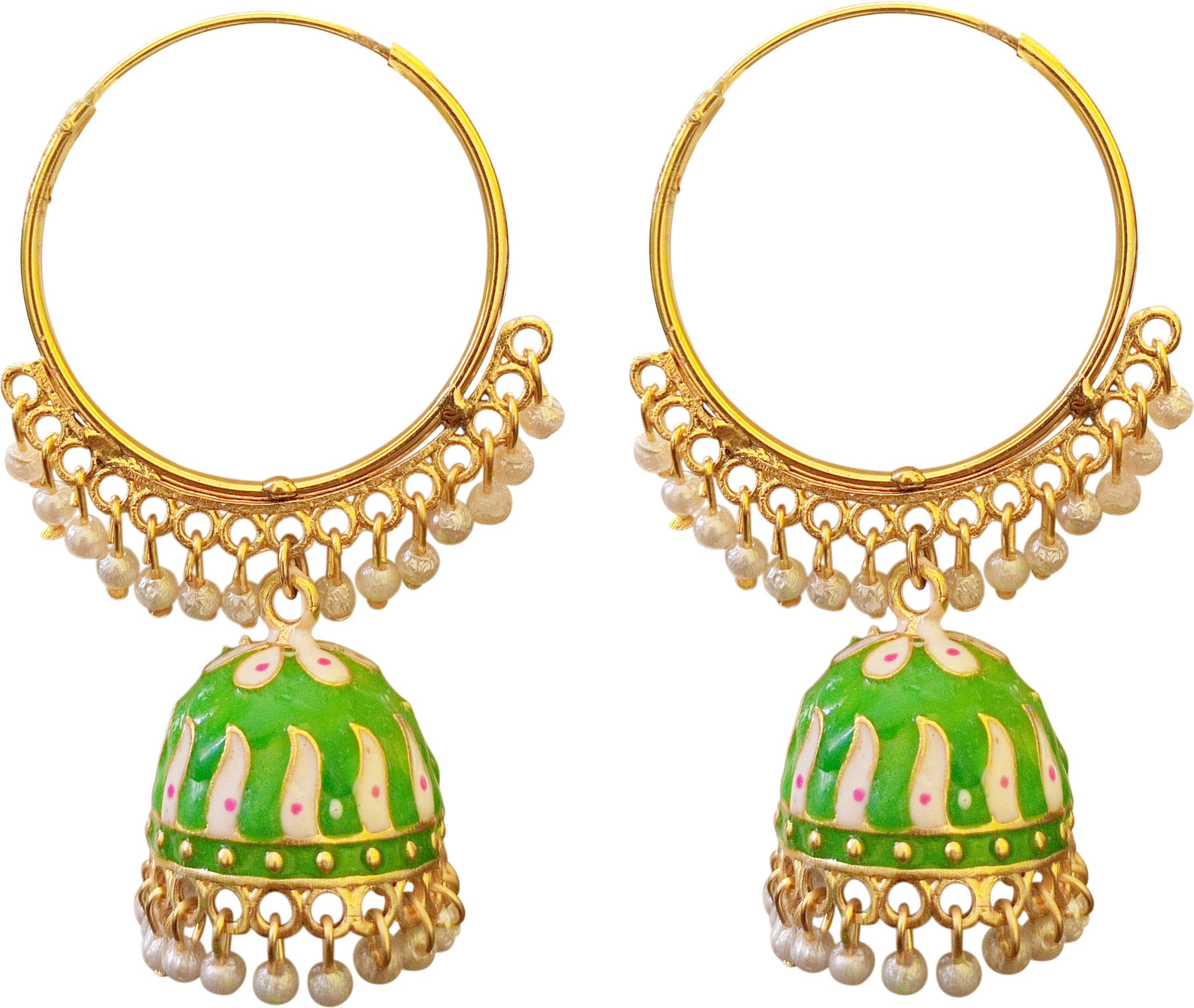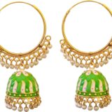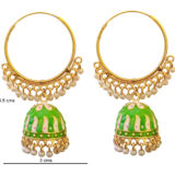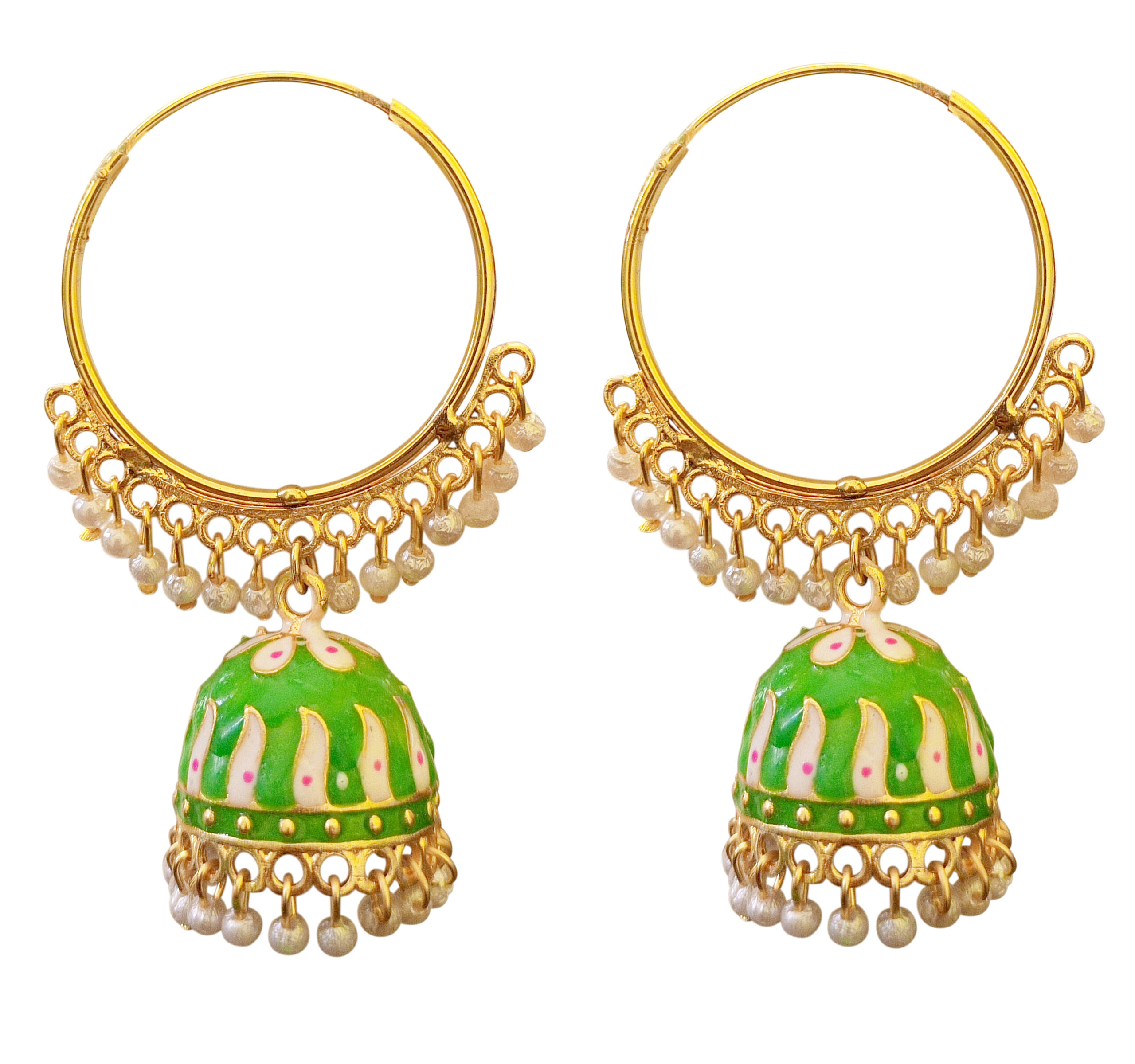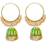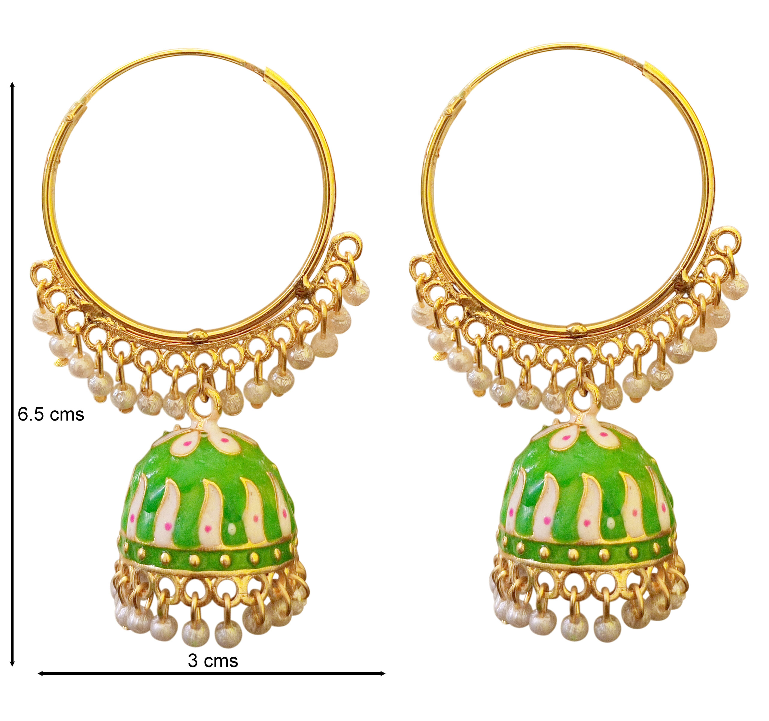 These elegant hoop earrings showcase a beautiful blend of traditional craftsmanship and festive charm. Finished in a rich gold tone, the hoops are detailed with delicate pearl drops and highlighted by a vibrant green meenakari jhumka. The hand-enamelled motifs add colour and depth, while the dangling pearls bring graceful movement, making these earrings a striking ethnic statement.
