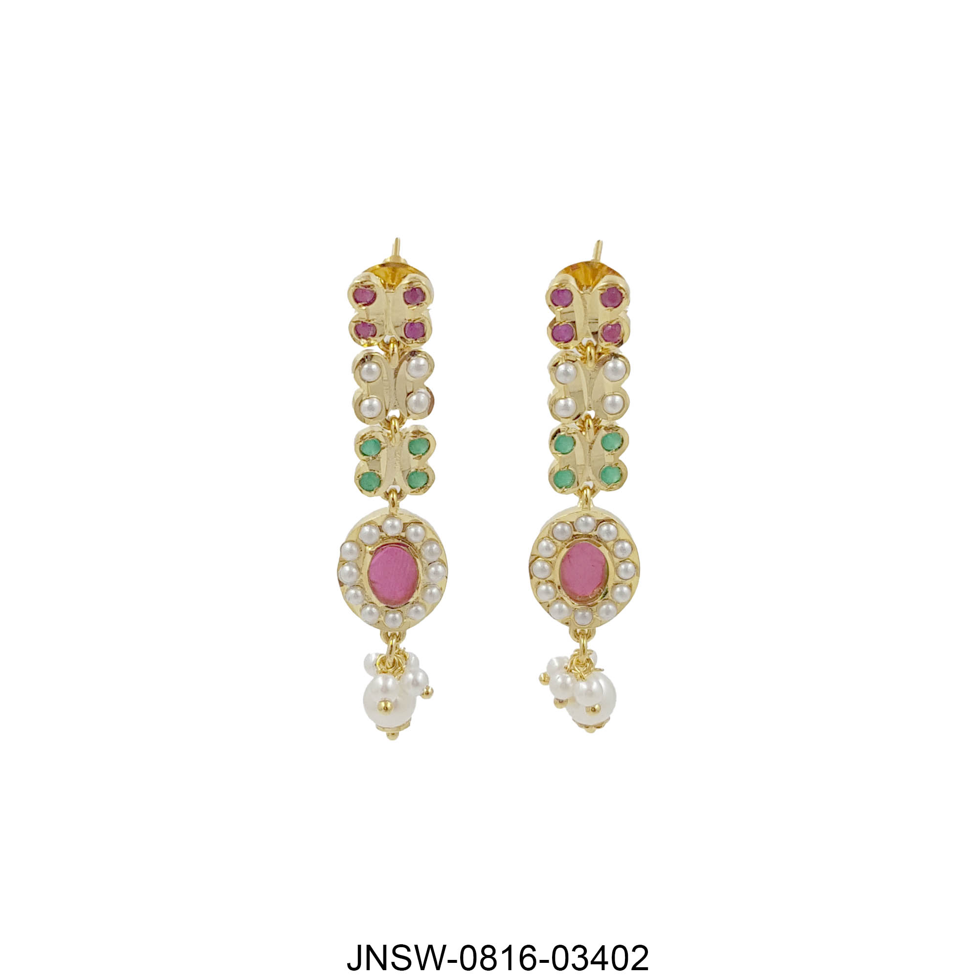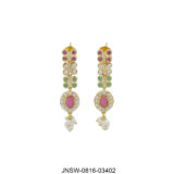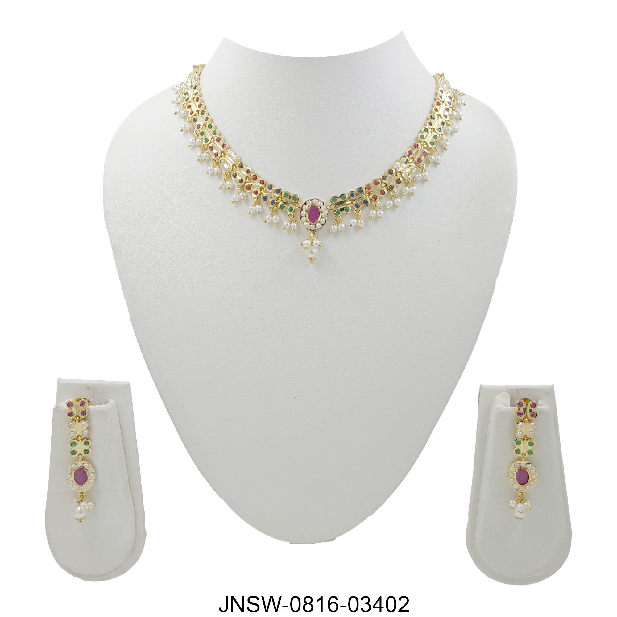 A stunning handcrafted necklace set featuring a rich blend of green, red, and white stones, highlighted by a regal ruby-toned central motif. Finished with delicate pearl droplets for a soft, traditional charm. Paired with matching earrings, this piece brings a perfect balance of colour, elegance, and festive grandeur.