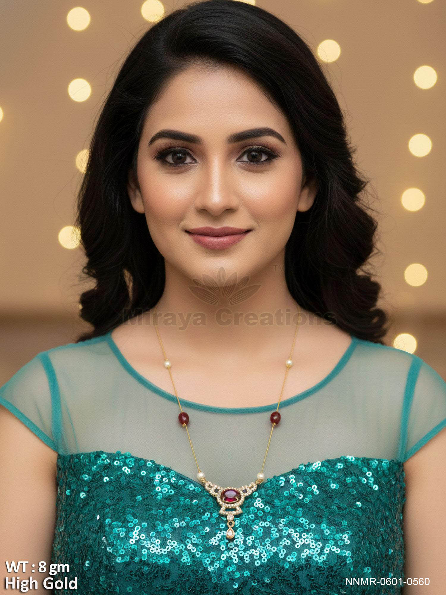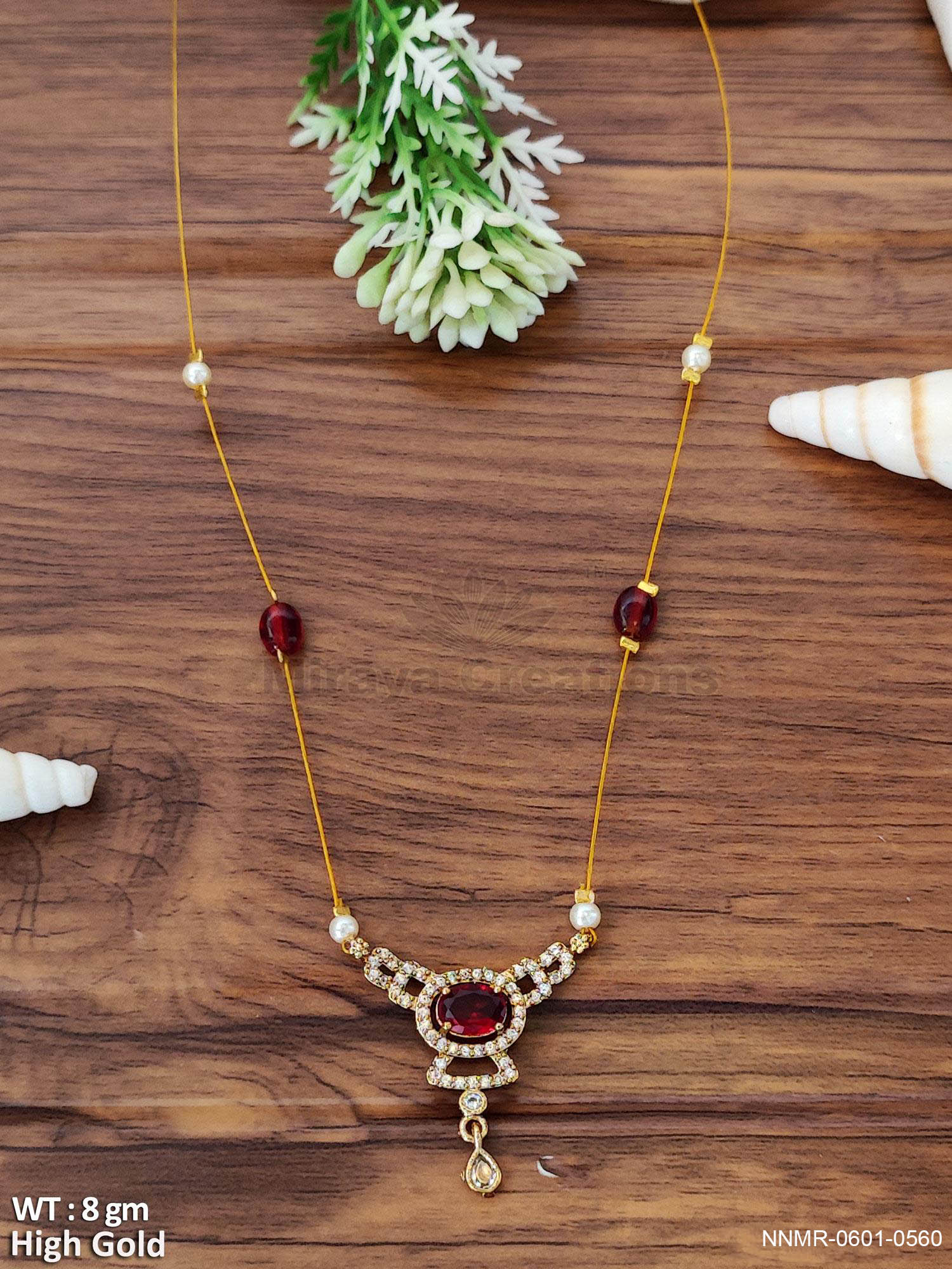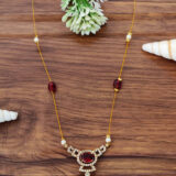 This elegant high gold finish necklace features a slender chain accented with delicate pearls and rich ruby-tone beads. The centrepiece showcases a deep red oval stone framed with sparkling white accents and a graceful drop detail, adding a touch of traditional charm with modern finesse. Lightweight yet striking, this piece is perfect for both festive and refined occasions.