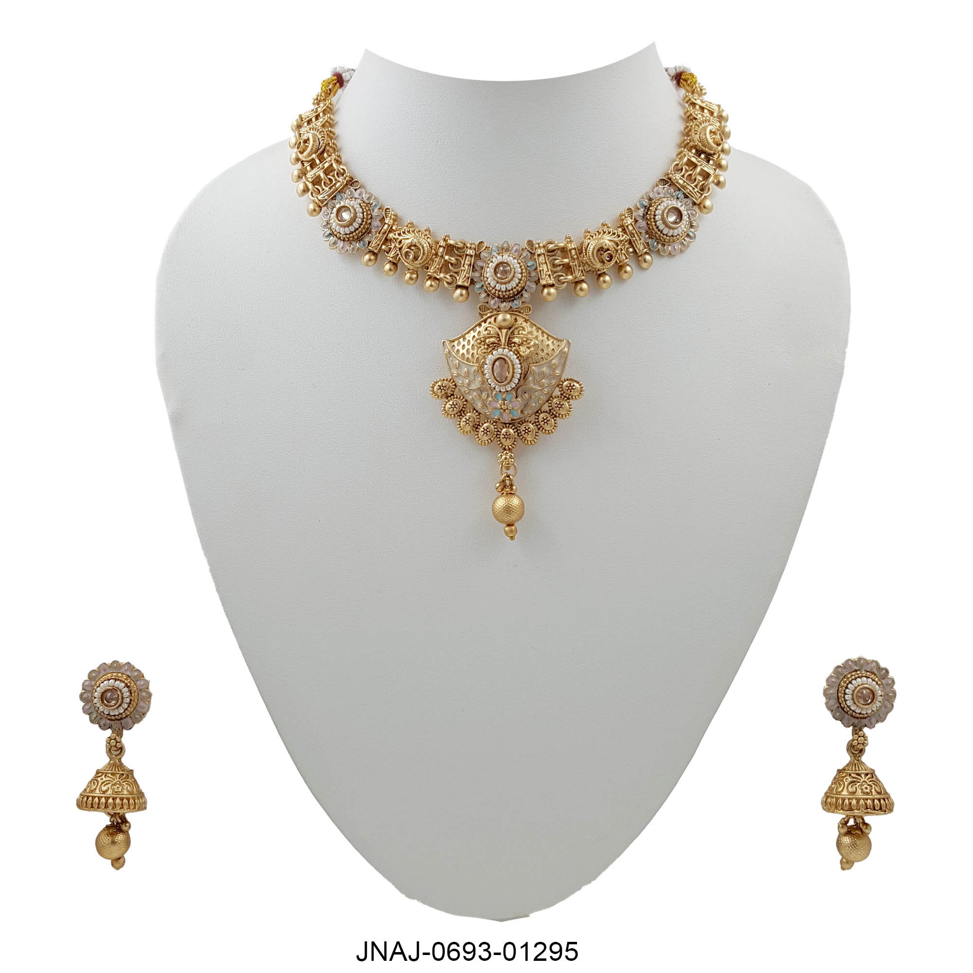 Grace meets divinity in this exquisite Ivory-Gold Temple Necklace Set, featuring intricately carved motifs, antique gold finish, and delicate pearl embellishments. The statement pendant and matching jhumkis bring a serene charm to your traditional wardrobe, perfect for brides, bridesmaids, or cultural celebrations. Subtle yet regal, this set captures timeless elegance with every detail.
