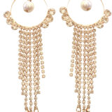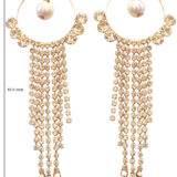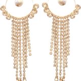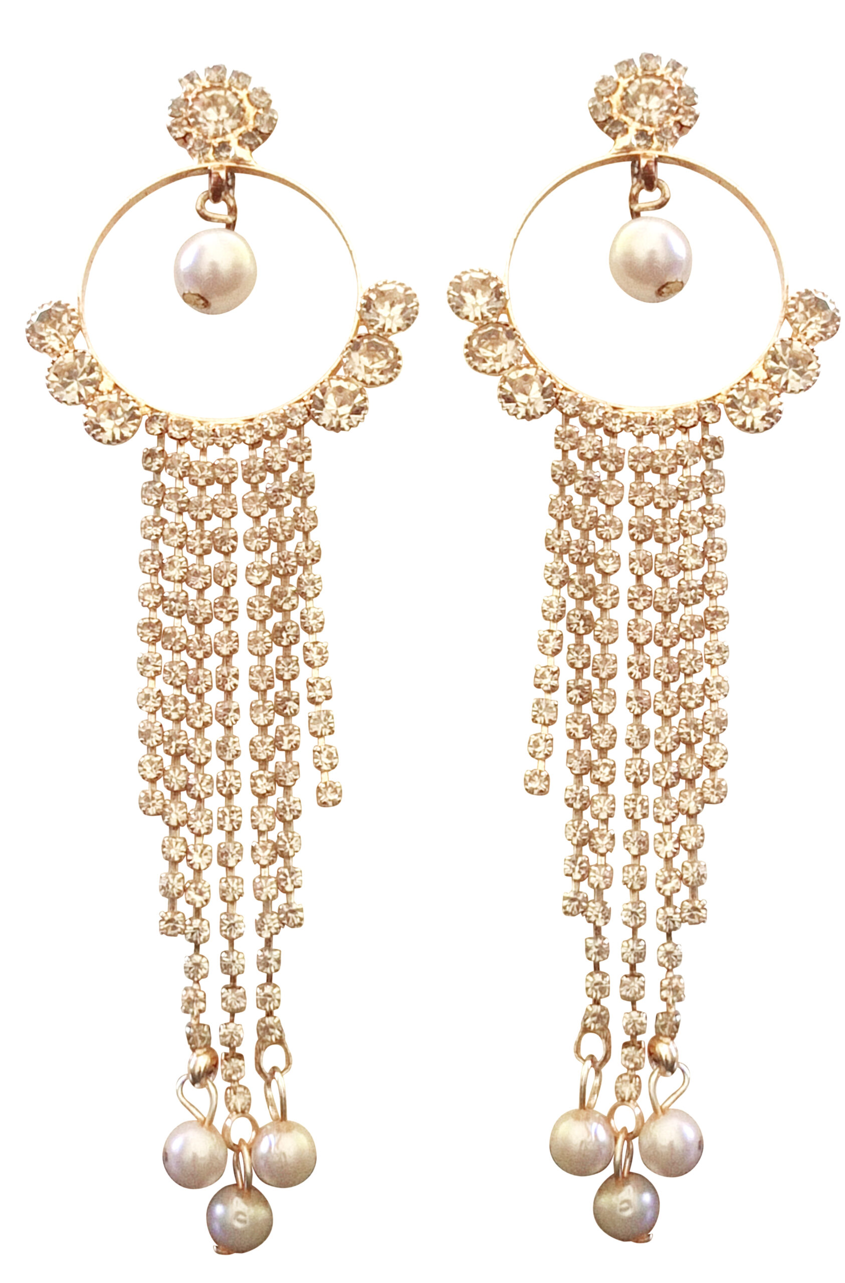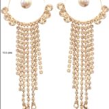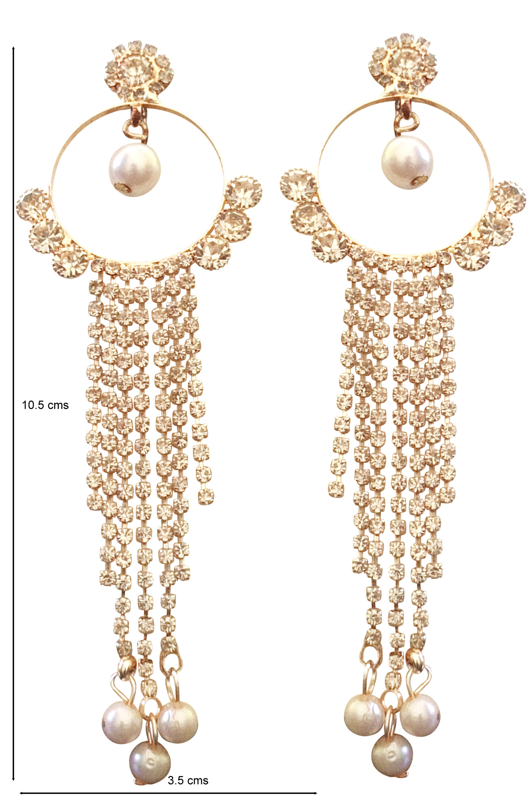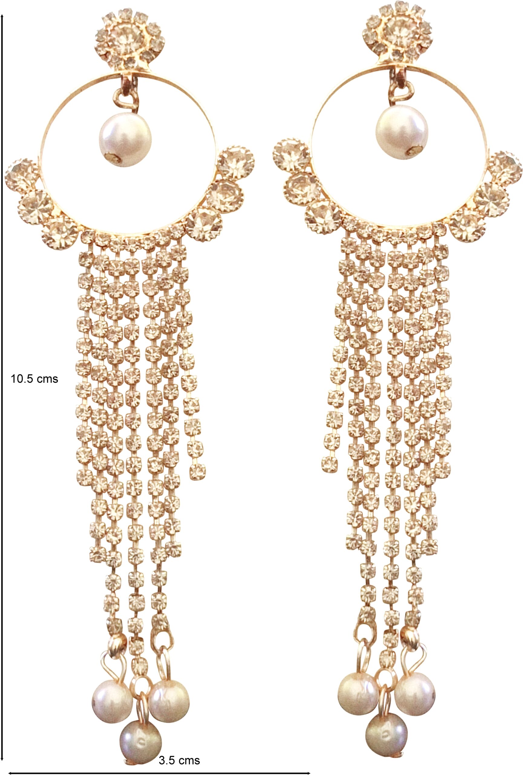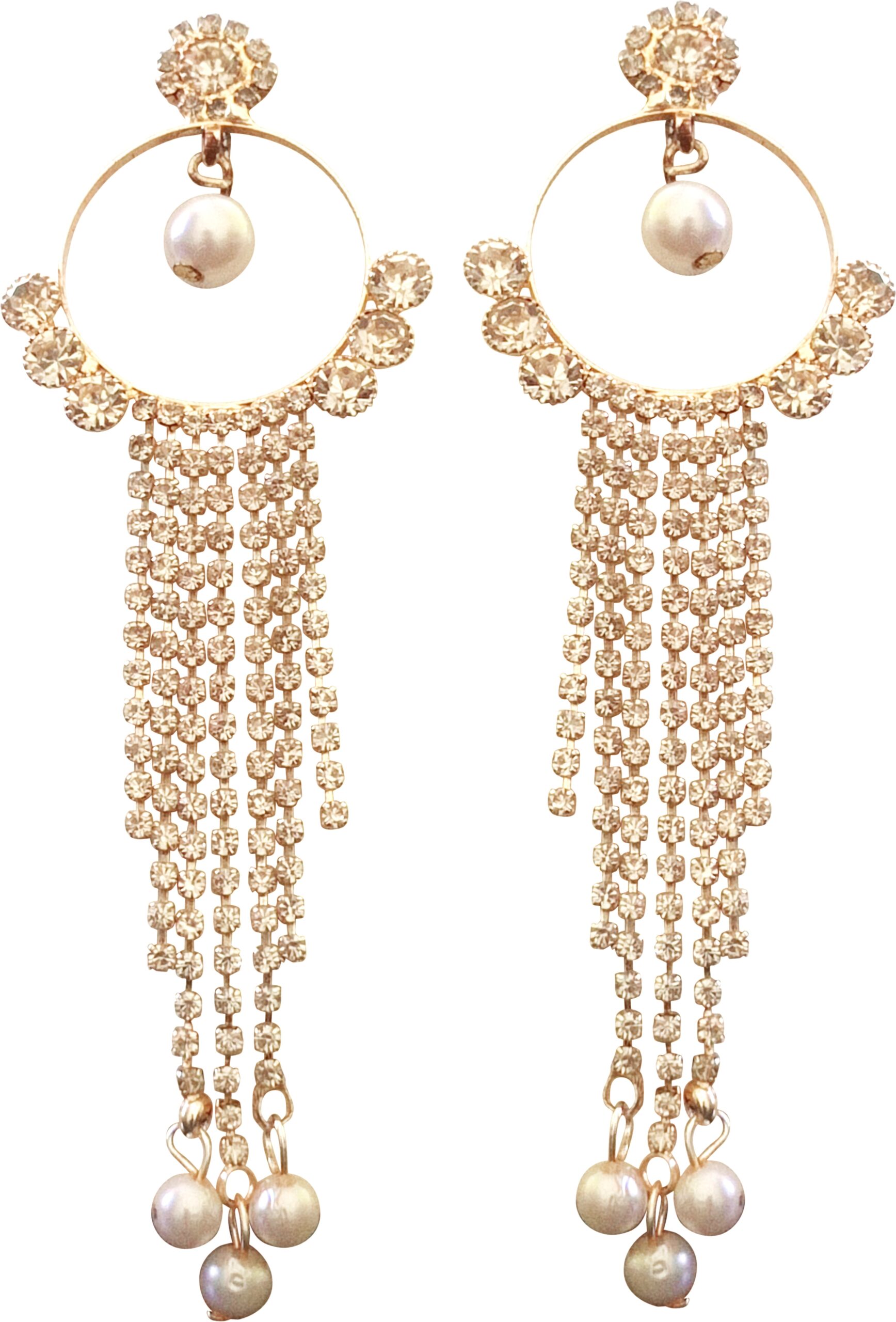 Add effortless elegance to your look with these stunning Gold-Tone Tassel Earrings featuring soft champagne crystals and delicate pearl drops. The circular hoop design is accented with sparkling stones and finished with cascading crystal strands that sway beautifully, while tiny pearls at the ends add a touch of classic charm. Perfect for weddings, festive celebrations, and evening soirées, these earrings blend modern glam with timeless grace. Lightweight yet eye-catching, they’re ideal for elevating both ethnic and western outfits.