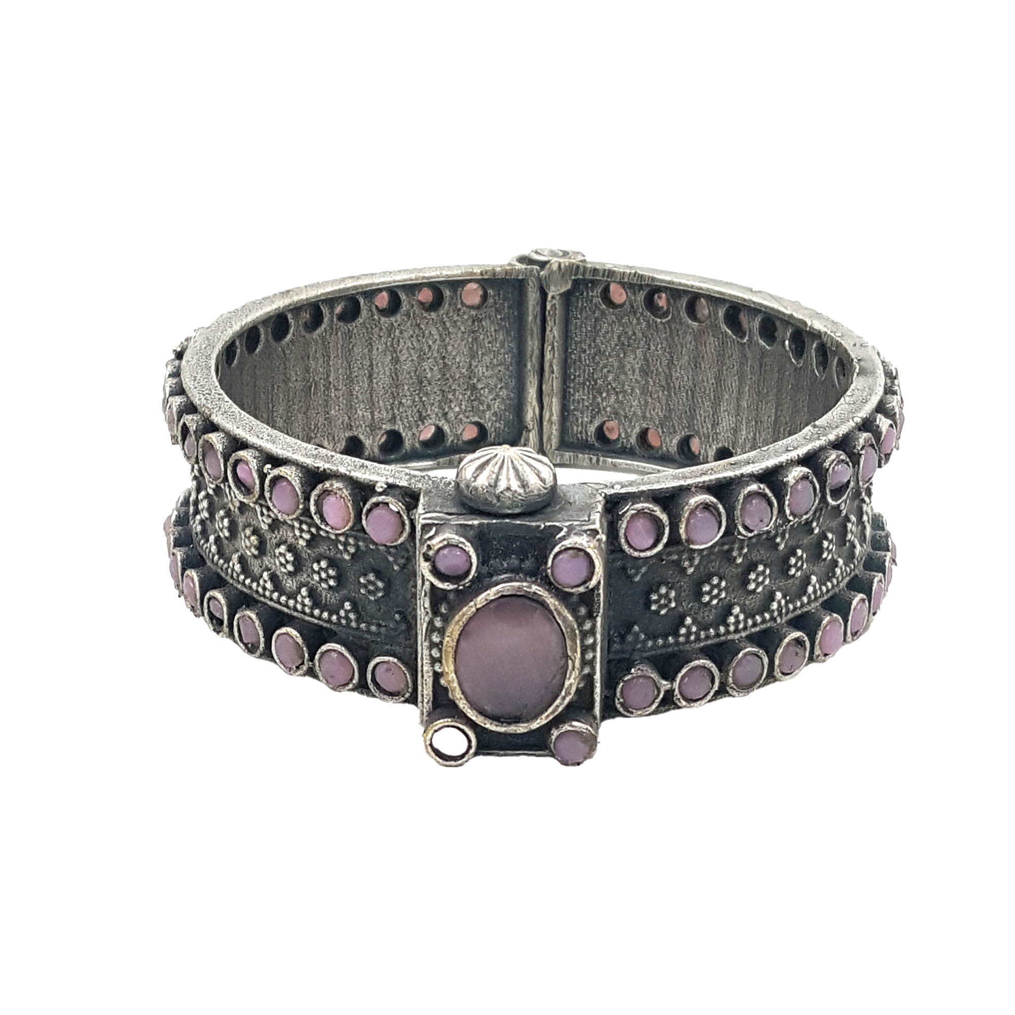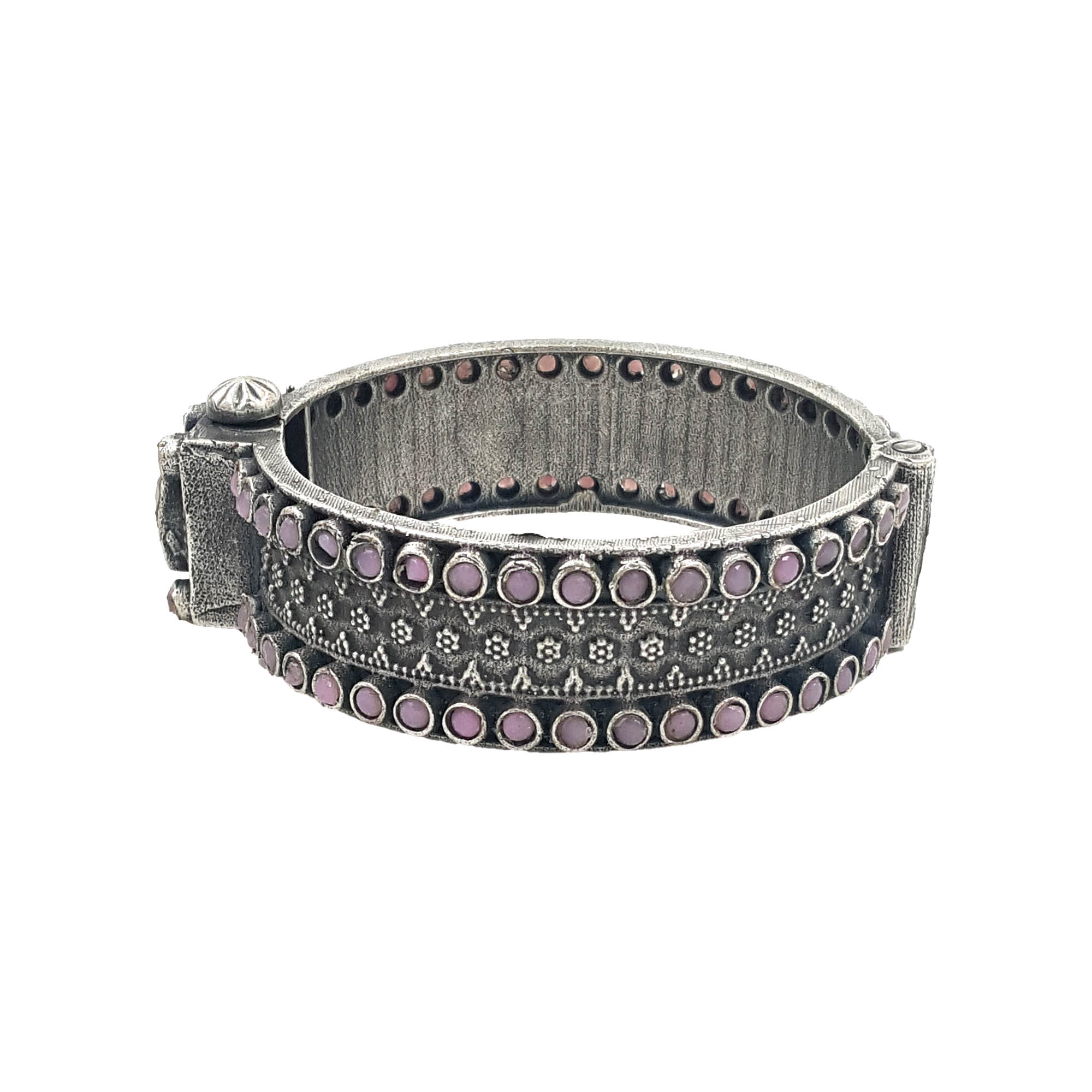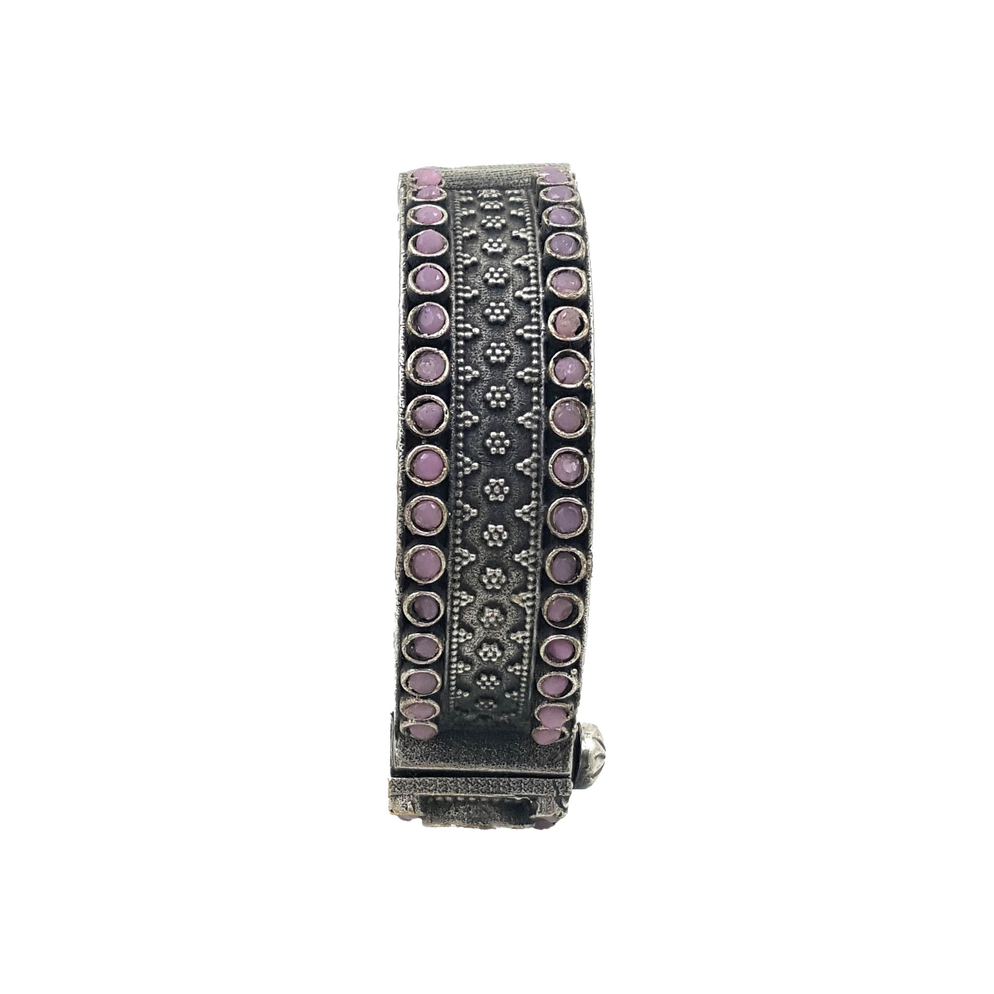 This vintage-style oxidised kada is adorned with soft lilac stones that bring a delicate contrast to its bold metallic frame. The intricate floral motifs and symmetrical layout enhance its traditional charm while the pastel detailing adds a modern edge. A perfect accessory for someone who loves classic elegance with a twist of colour.