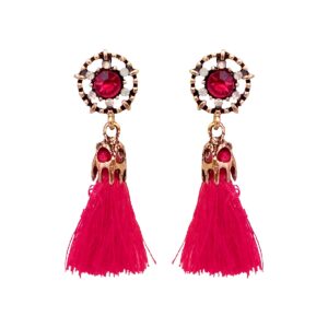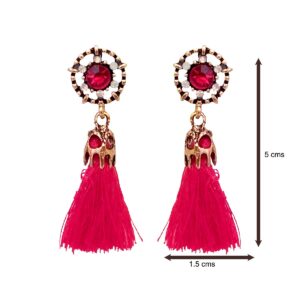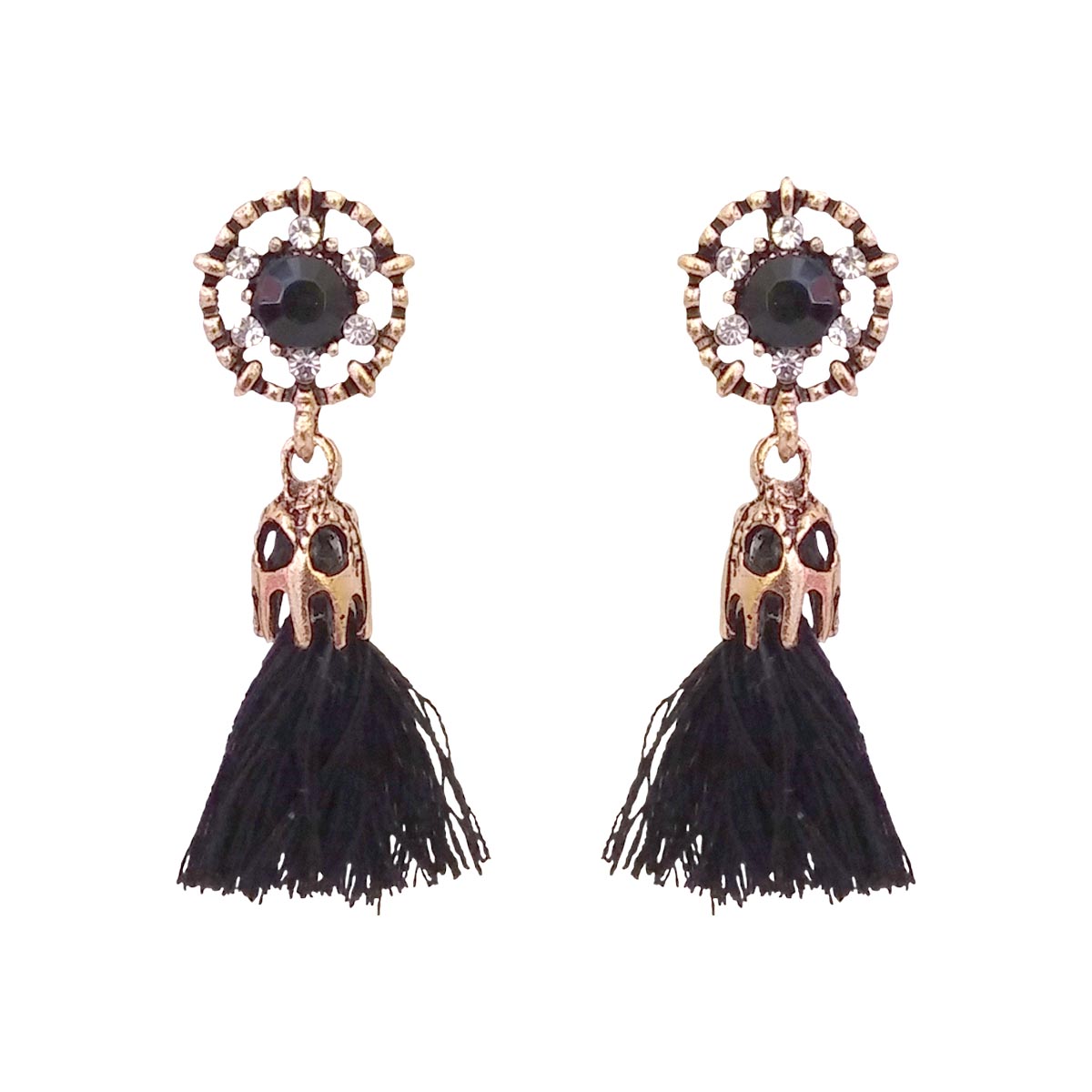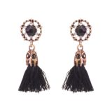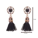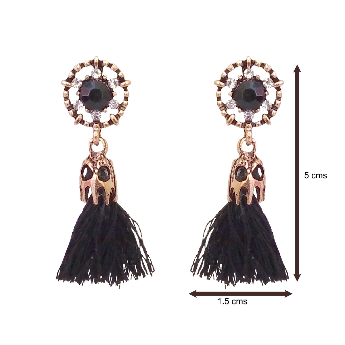These elegant floral drop earrings feature a deep black stone at the centre, surrounded by delicate crystal accents set in an antique gold finish. The design flows into soft black tassels that add graceful movement and a touch of drama. Refined yet versatile, these earrings strike a perfect balance between classic charm and modern style, making them an easy choice for both festive occasions and evening wear.