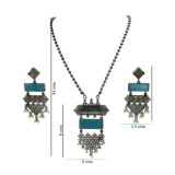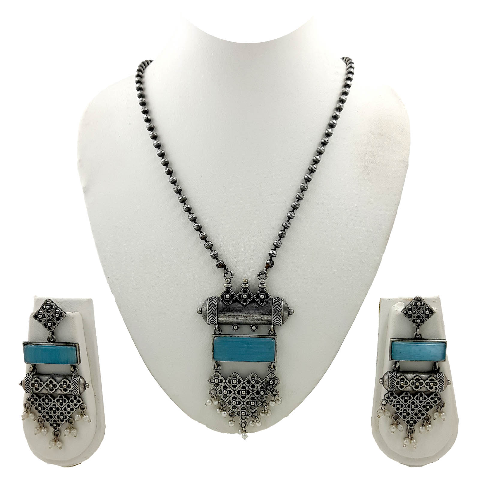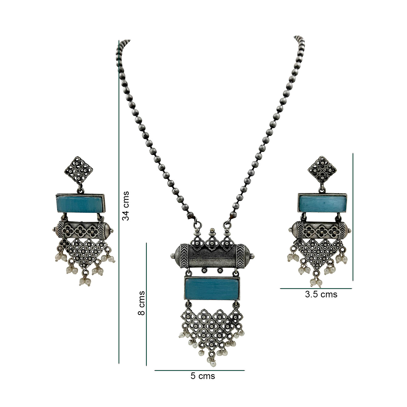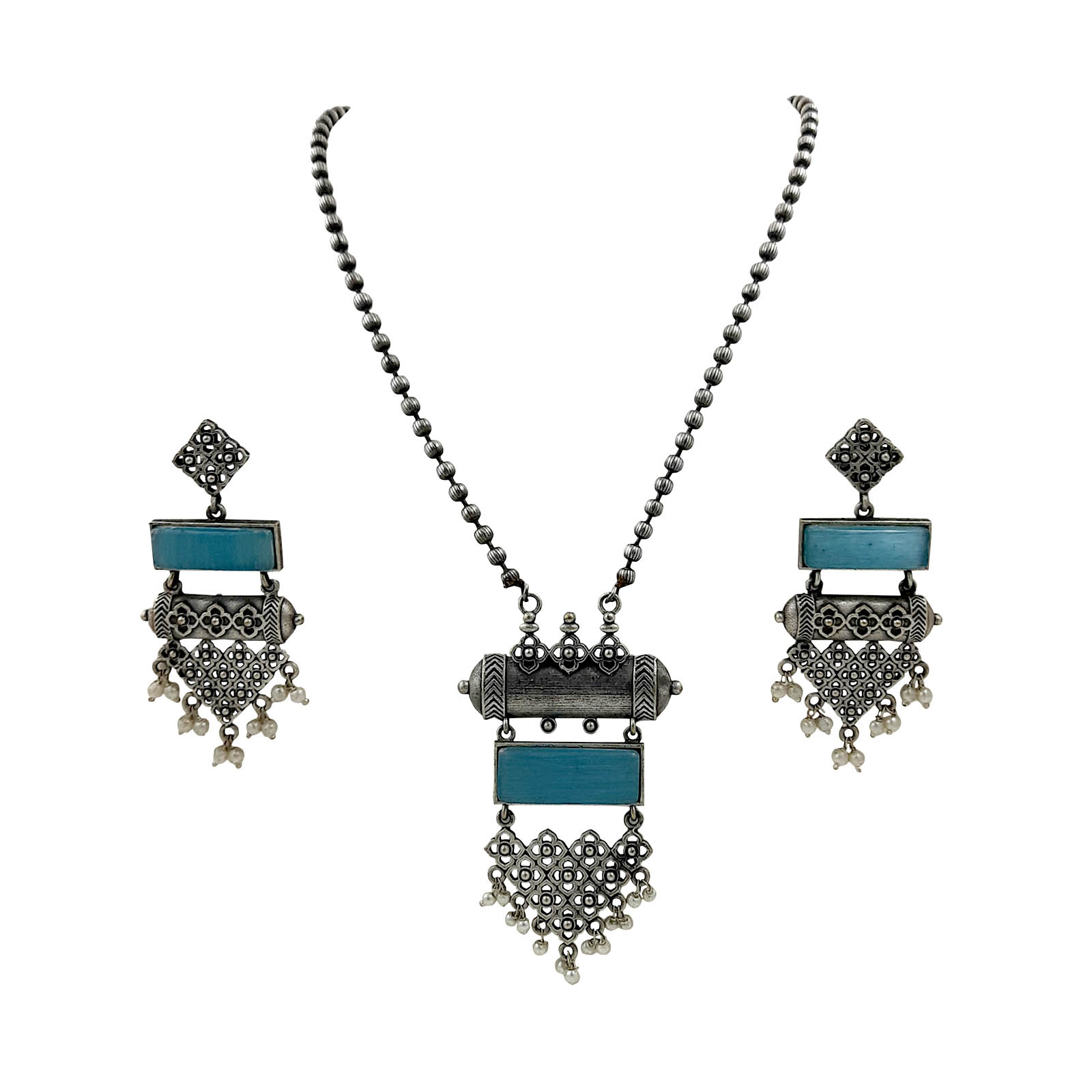 A stunning blend of antique charm and modern flair, the Ocean Mist Oxidized Necklace Set features a bold pendant with intricate tribal-inspired carvings and cool blue enamel accents. The oxidized silver finish is beautifully detailed with floral motifs and delicate pearl-like bead tassels, while the matching earrings perfectly echo the statement look. Ideal for adding a splash of elegance to any ethnic or fusion outfit.