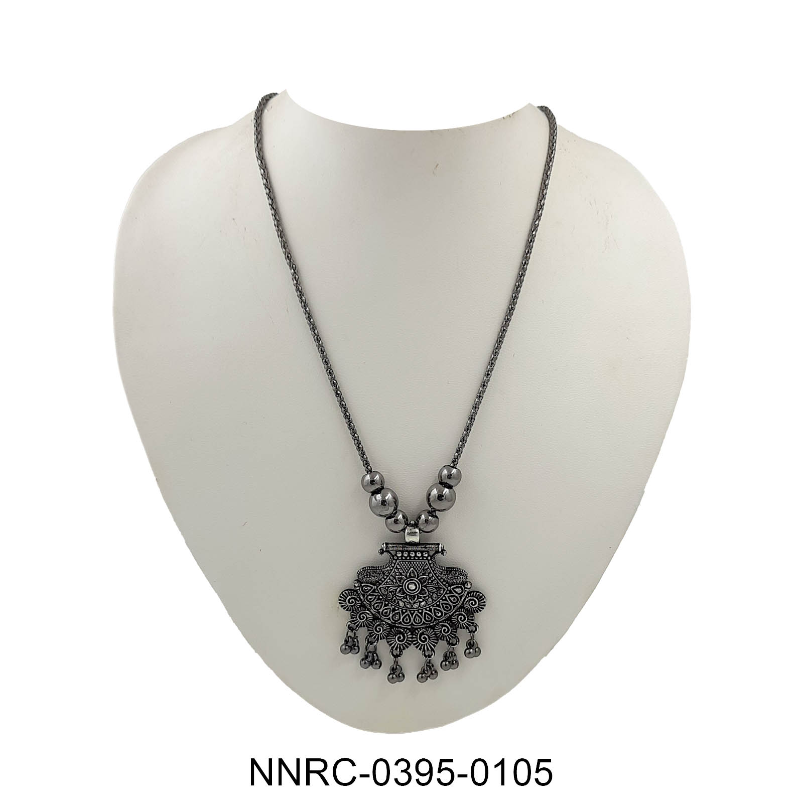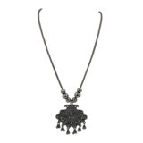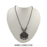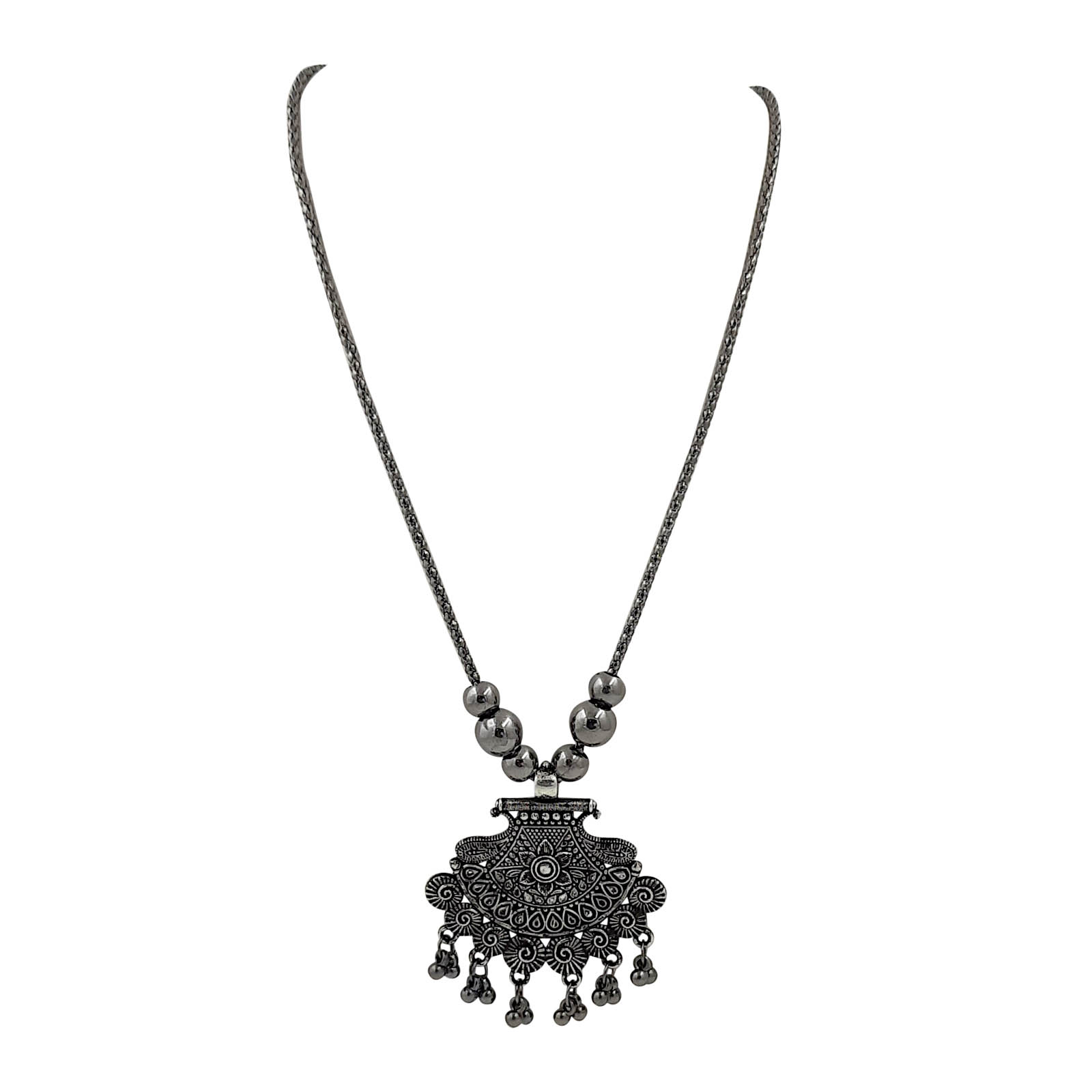 A graceful oxidized silver pendant necklace crafted in a fan-shaped motif with floral engravings and dainty bead danglers. The antique finish gives it a traditional yet versatile charm, ideal for ethnic as well as Indo-fusion looks.
