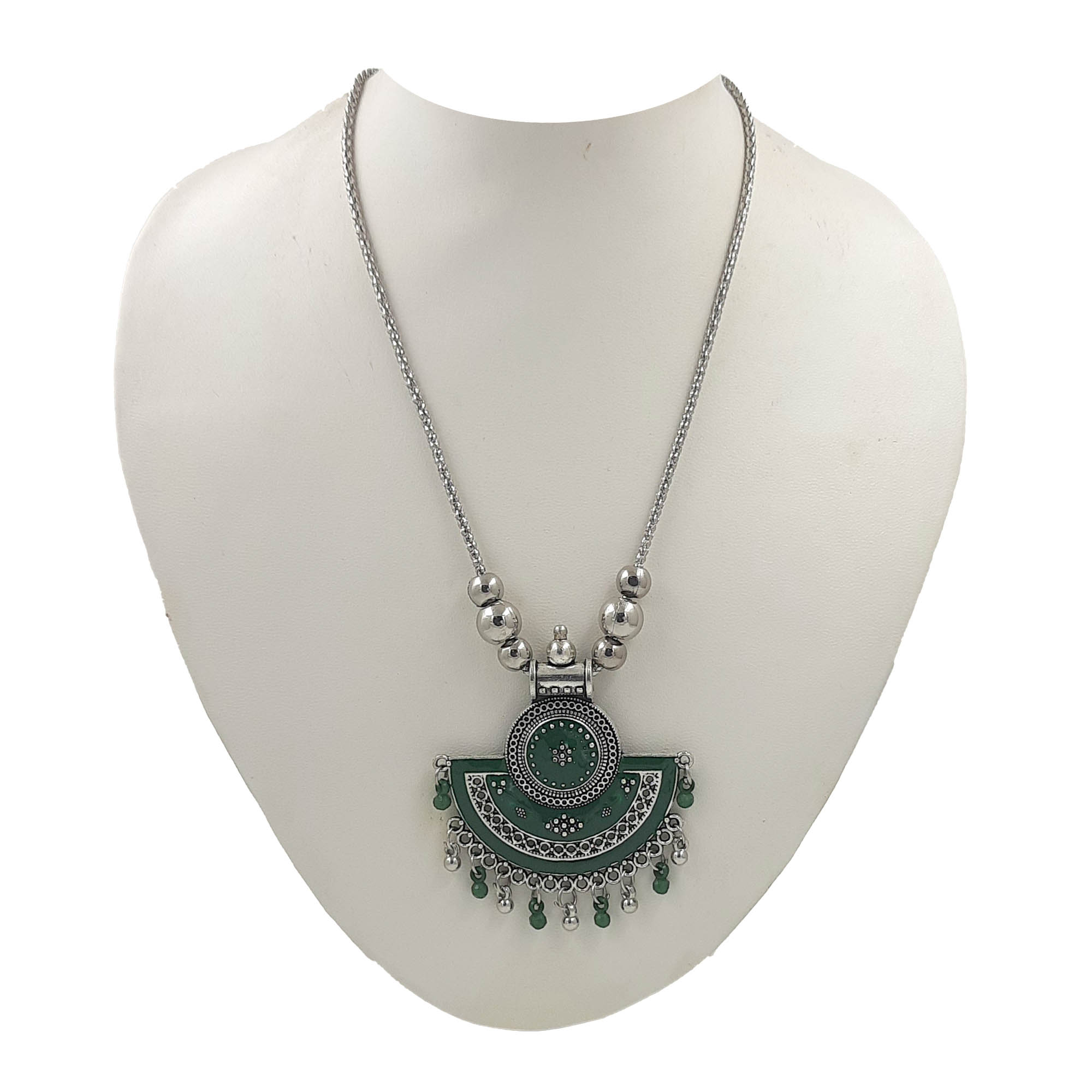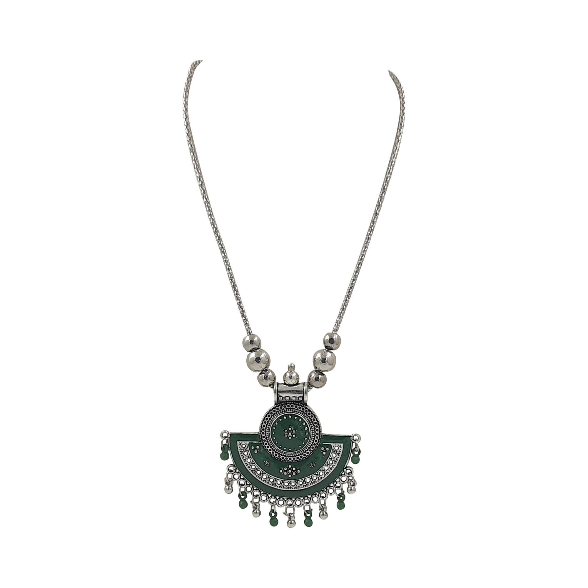 This oxidised silver necklace with a striking green enamel pendant brings together earthy elegance and festive charm. The semi-circular design with delicate bead danglings makes it a versatile piece that adds a refreshing pop of color to both ethnic and fusion outfits.