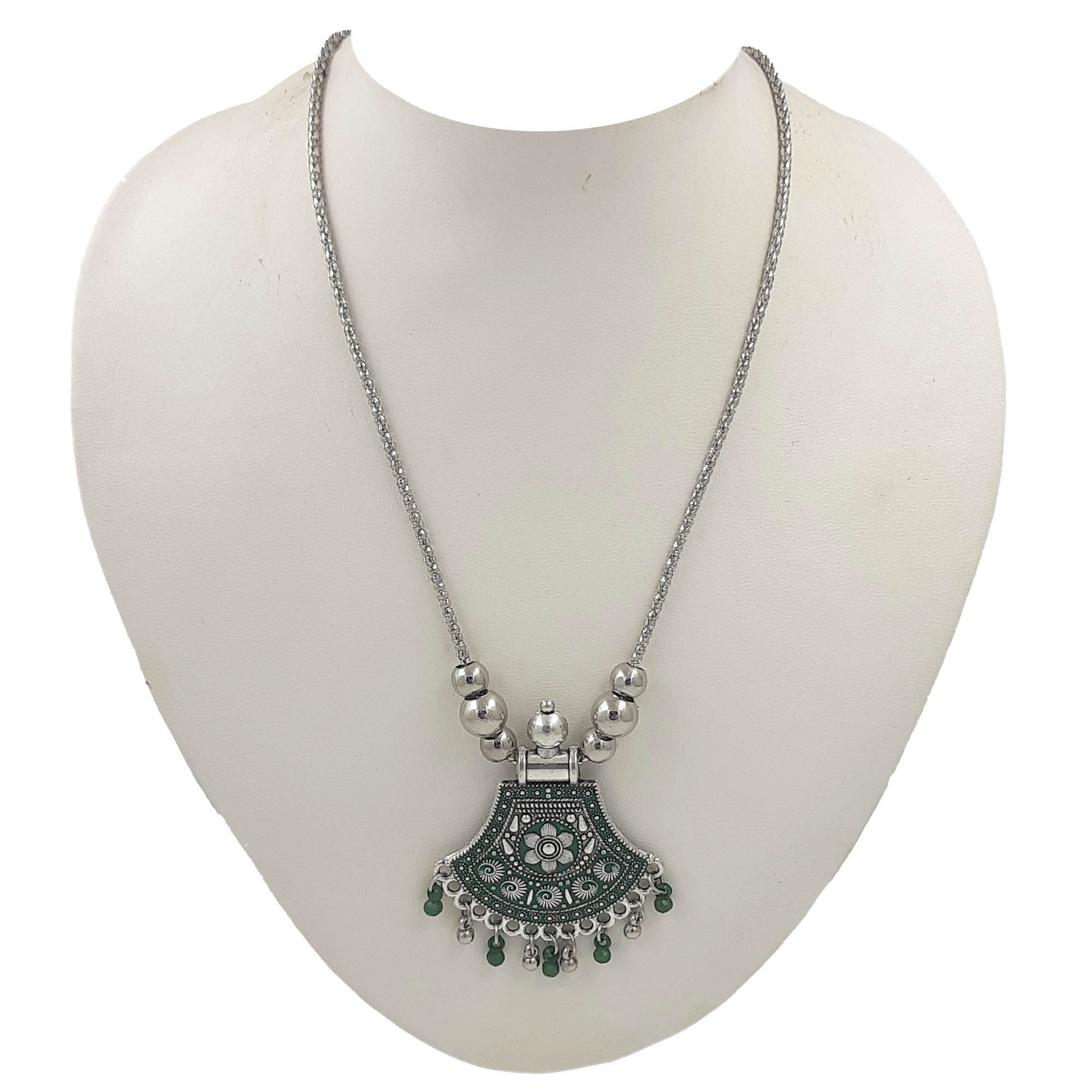 A striking oxidized silver necklace with a Green enamel floral pendant, detailed with traditional motifs and dangling beads. The bold green shade adds vibrance and festive charm to any outfit.