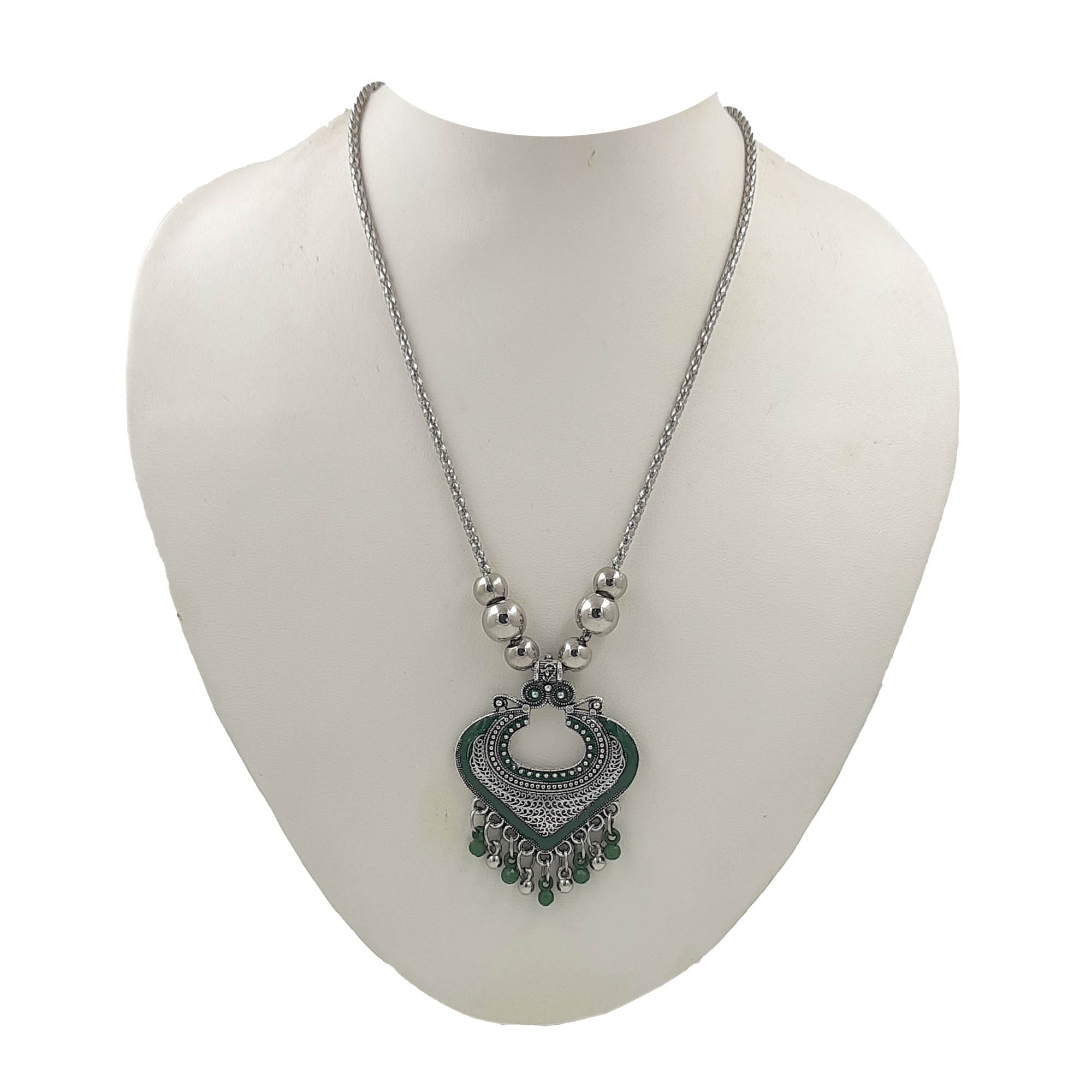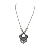 A bold and elegant oxidized silver necklace featuring a heart-shaped pendant with intricate carvings and deep Green enamel detailing. The design is completed with delicate bead danglers that add movement and charm.