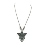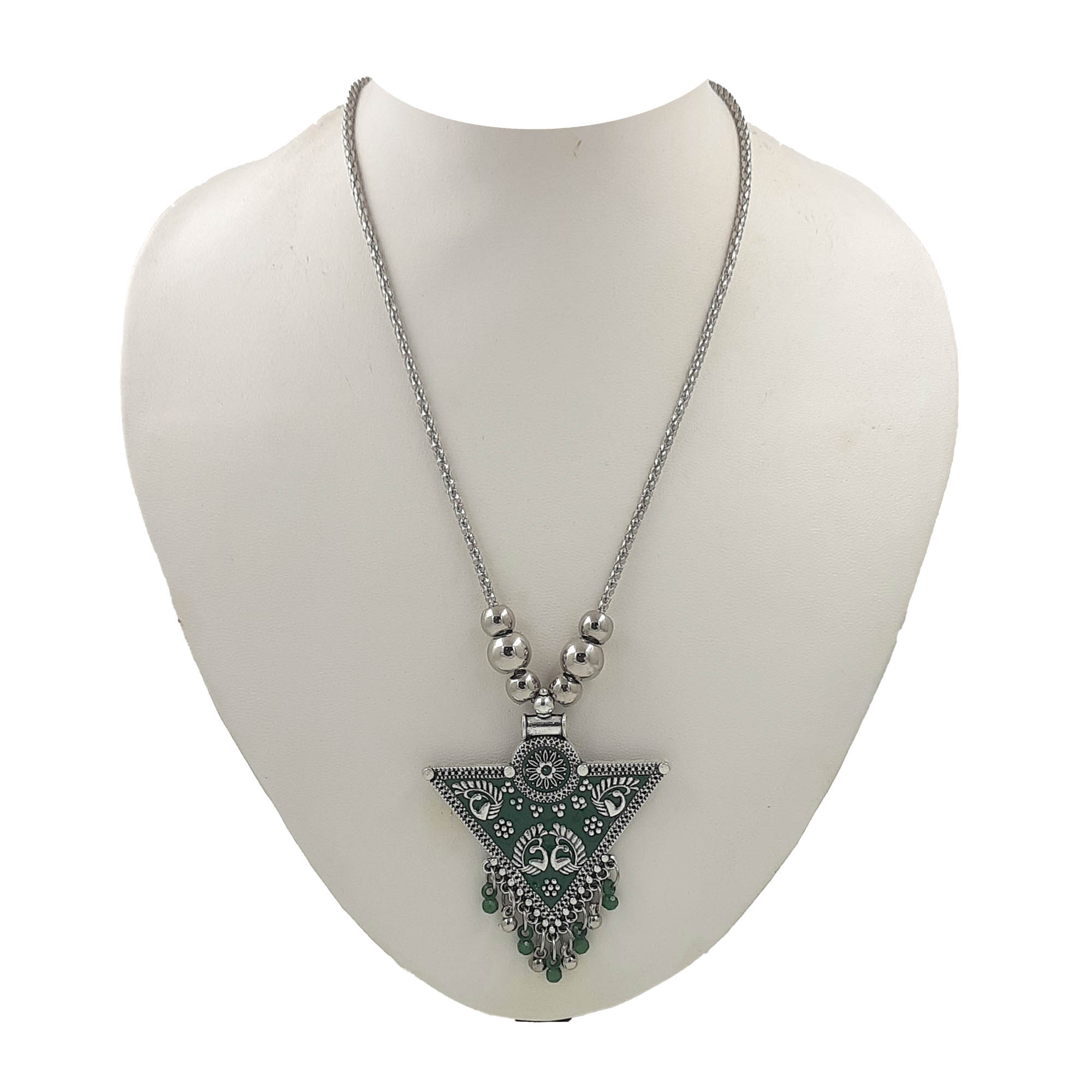 A timeless piece in oxidised silver, this necklace features a striking green enamel triangular pendant adorned with floral patterns and hanging bead danglers. The earthy green shade brings out a calm yet festive charm, making it a versatile statement accessory.
