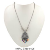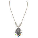 Grace your neckline with this elegant oxidized silver necklace featuring a finely crafted peacock-inspired pendant. The intricate design is accentuated with delicate detailing and finished with colorful bead danglers, adding a festive and vibrant charm. Perfect for those who love traditional jewelry with a playful twist.