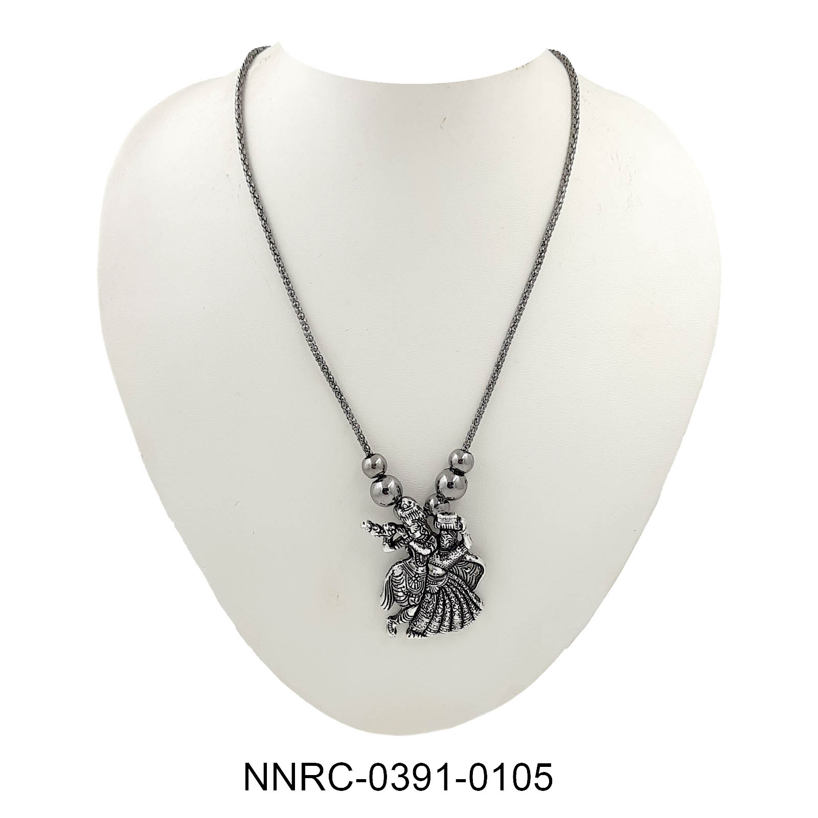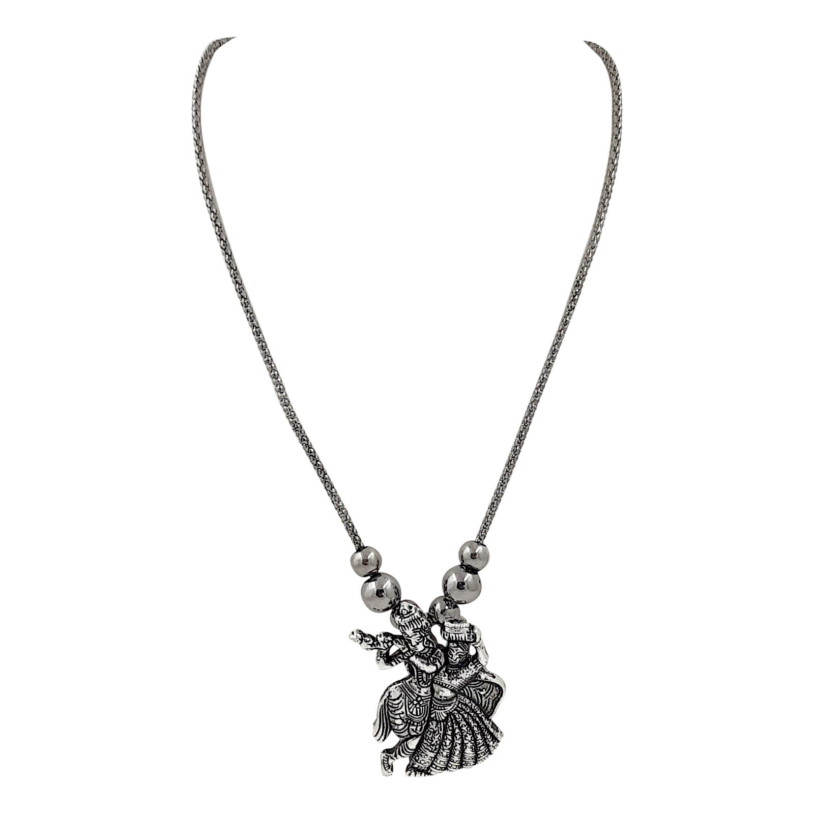 Celebrate divine love and tradition with this oxidized silver necklace featuring an intricately crafted Radha Krishna pendant. The antique finish highlights the fine detailing of the figures, while the spherical beads on the chain add extra charm. A spiritual yet stylish accessory that blends culture with elegance.