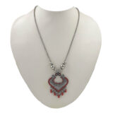 A bold and elegant oxidized silver necklace featuring a heart-shaped pendant with intricate carvings and deep red enamel detailing. The design is completed with delicate bead danglers that add movement and charm.