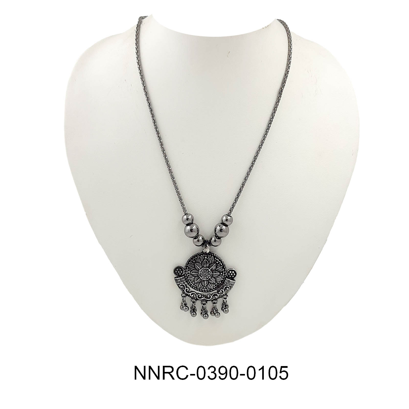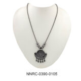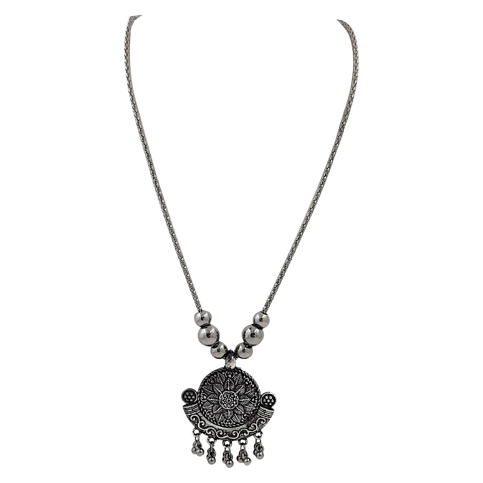 This oxidized silver necklace showcases a beautifully detailed round mandala-inspired pendant with intricate carvings and dangling beads. Its antique finish adds timeless elegance, making it a versatile piece for both festive and casual wear. The spherical silver beads on the chain further enhance its ethnic charm.