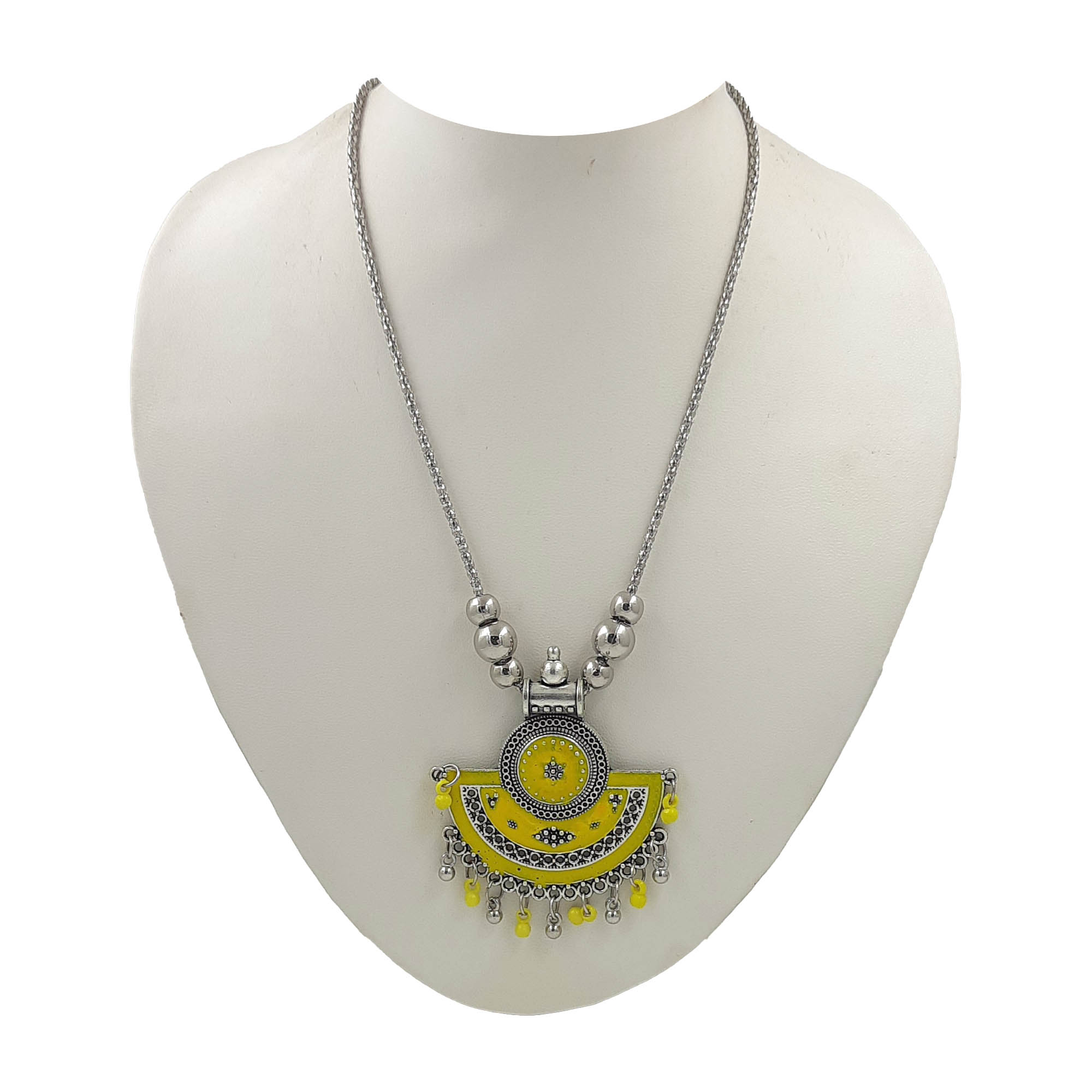 Bright, vibrant, and full of festive charm, this oxidized silver necklace features a bold yellow enamel semi-circular pendant. Detailed with traditional motifs and dangling bead accents, it beautifully combines ethnic artistry with a playful pop of color. A perfect accessory to bring sunshine to your traditional and Indo-western looks.